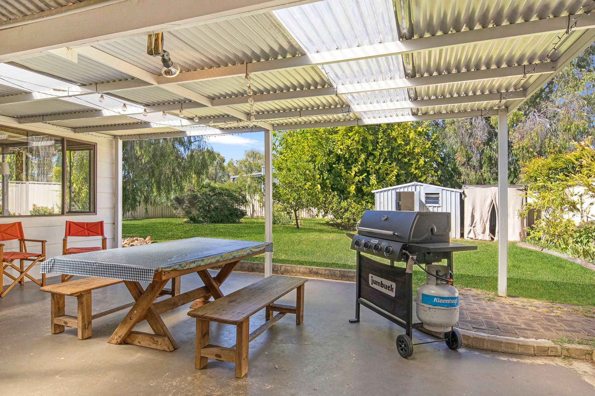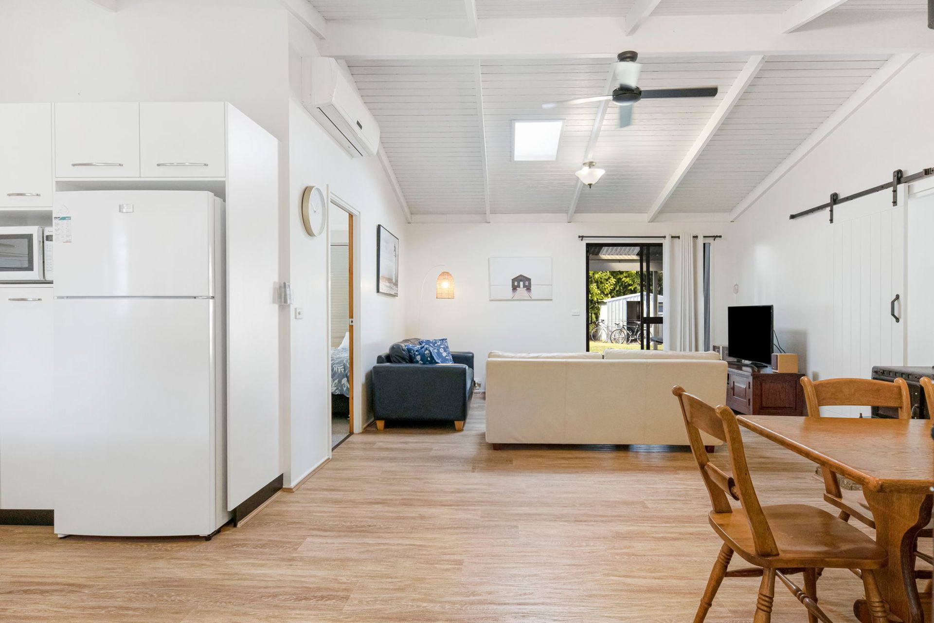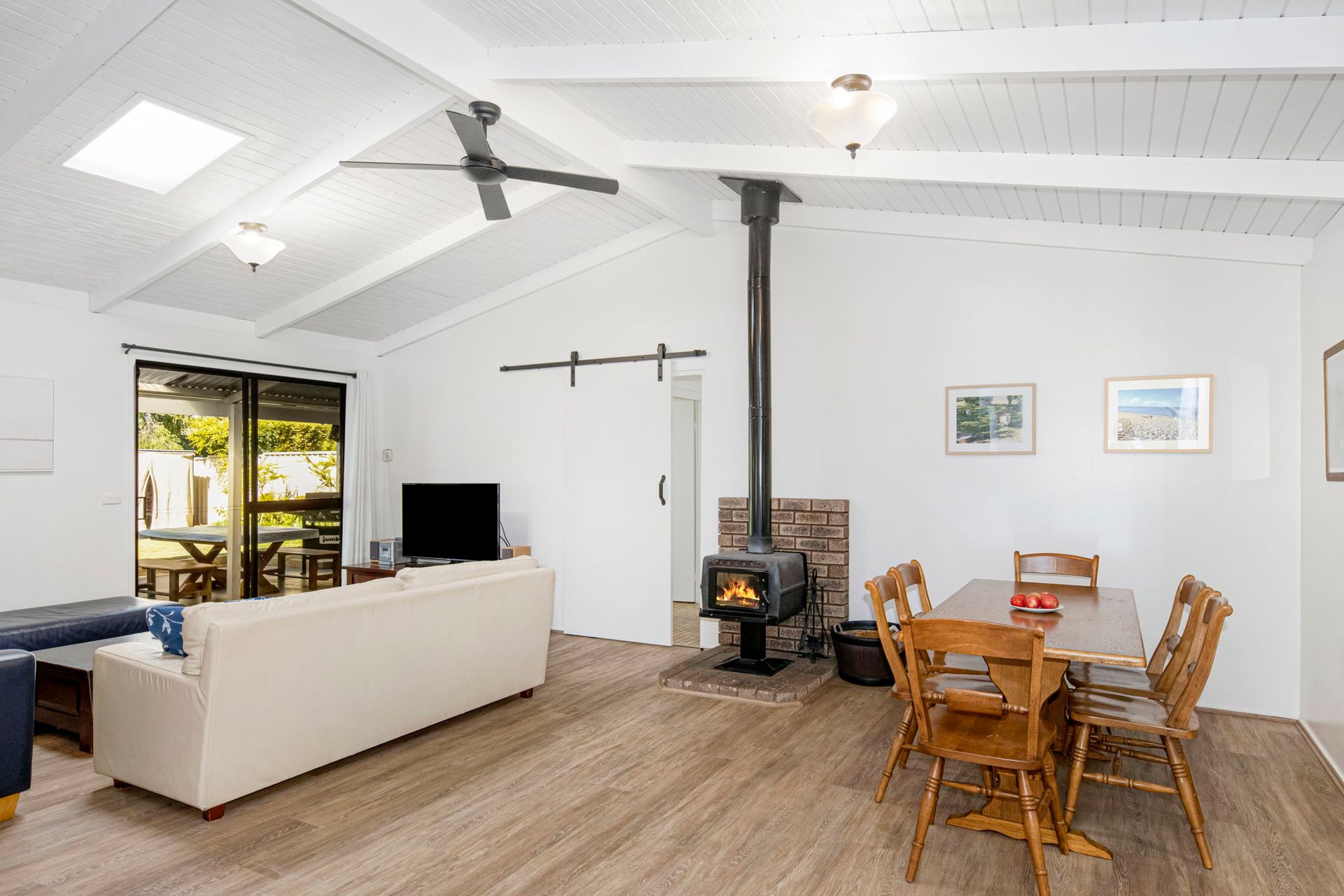 The garden area becomes a peaceful retreat after a day of surfing or visiting nearby attractions like the local wineries. An outside patio features a picnic BBQ setup and comfortable outdoor furniture, perfect for soaking up the coastal sunshine or hosting evening dinners.