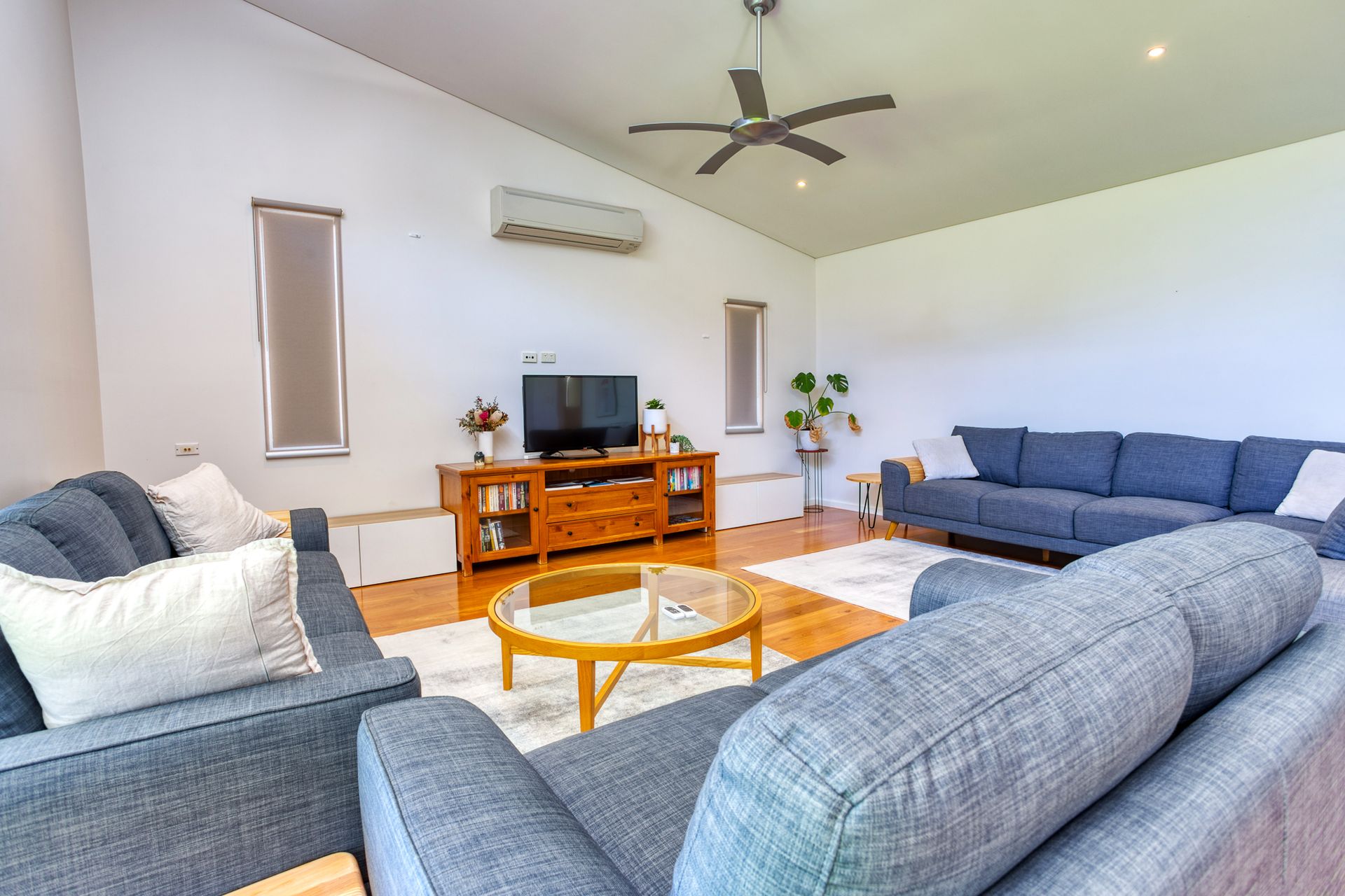 Main living area with reverse-cycle air conditioning, ceiling fans and direct alfresco access