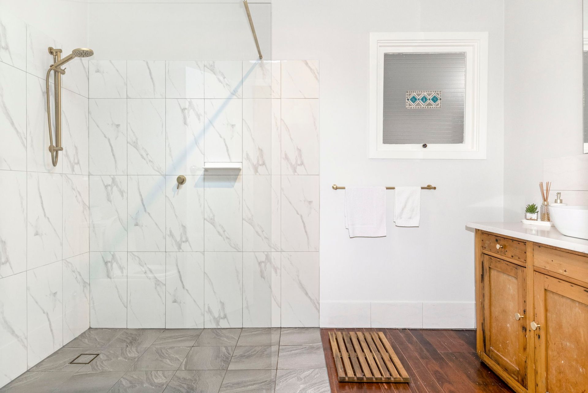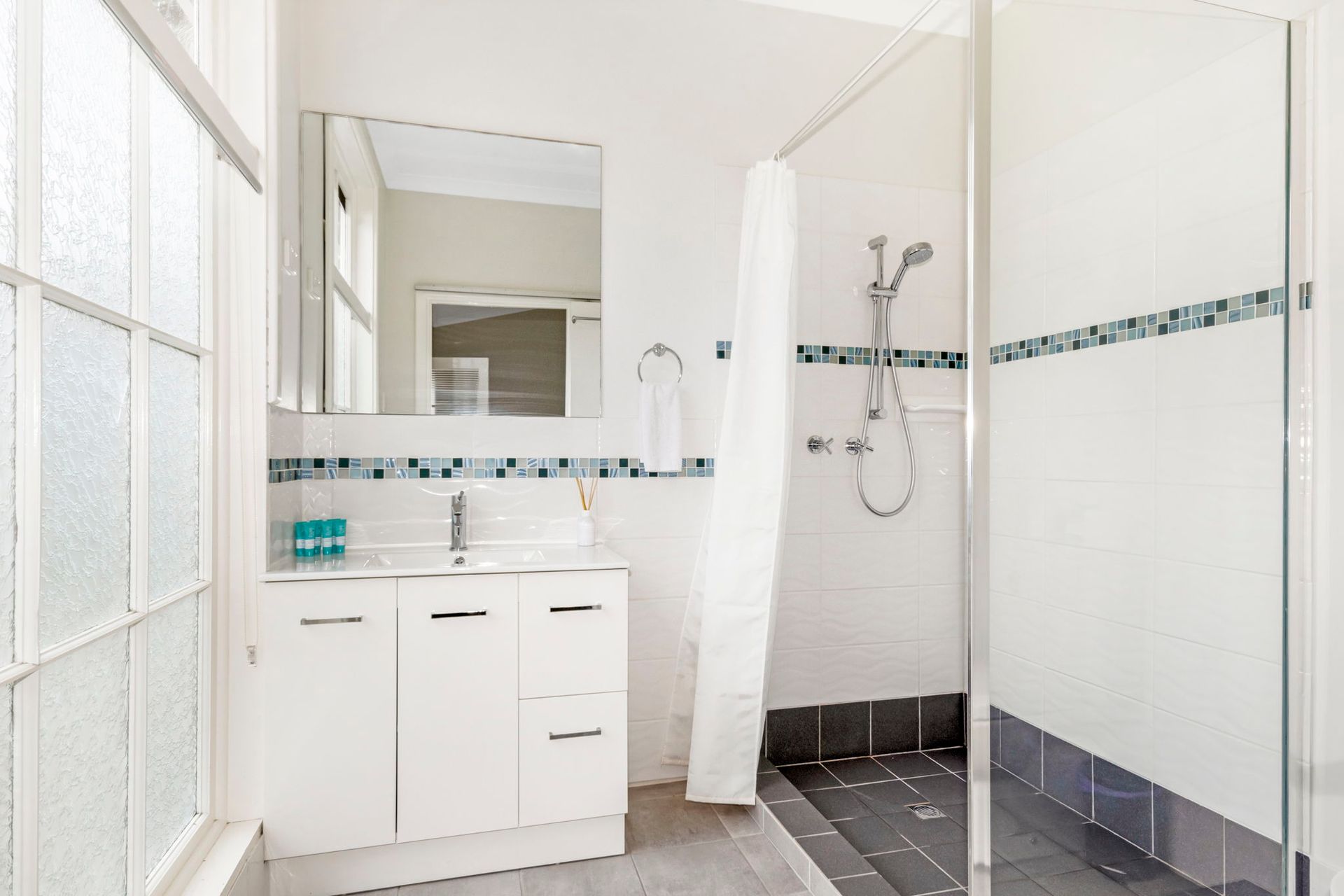 The family bathroom has been modernised with a large walk in shower, and large vanity.