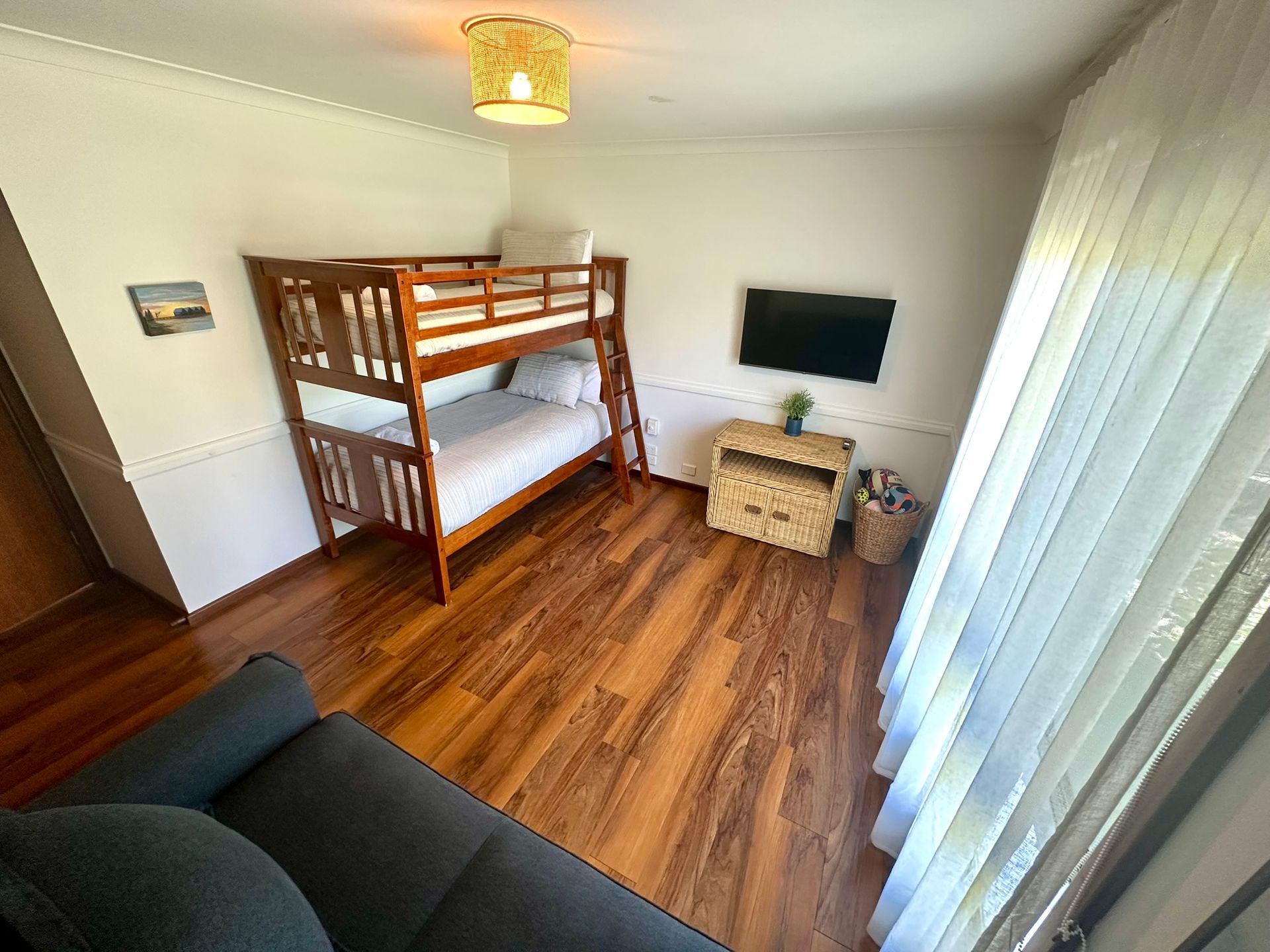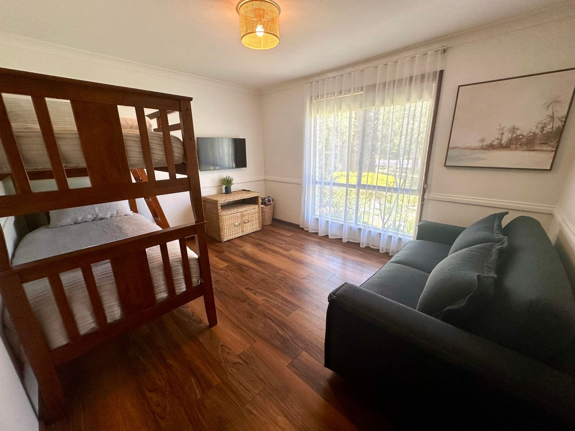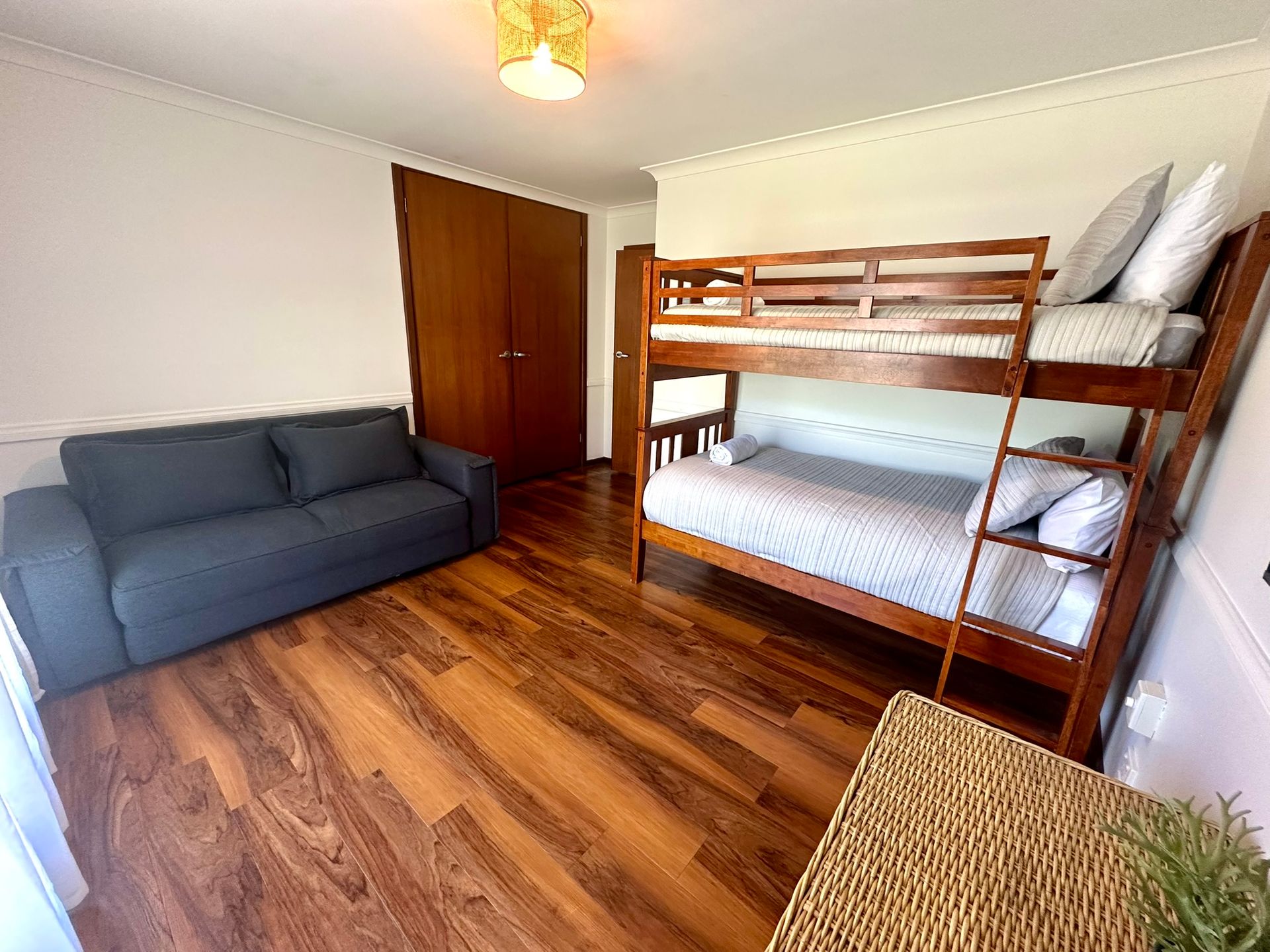 The master bedroom features a luxurious king bed and a private ensuite, while the second bedroom offers a comfortable queen bed. The third bedroom is perfect for kids, with bunk beds, a cozy couch, and a TV – their very own space to relax and play.