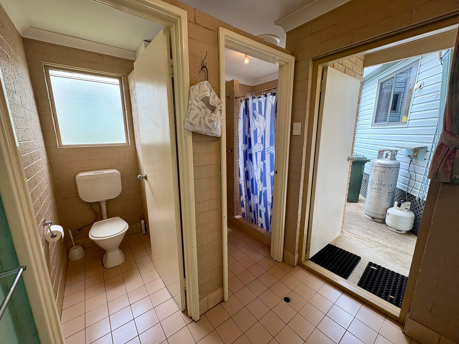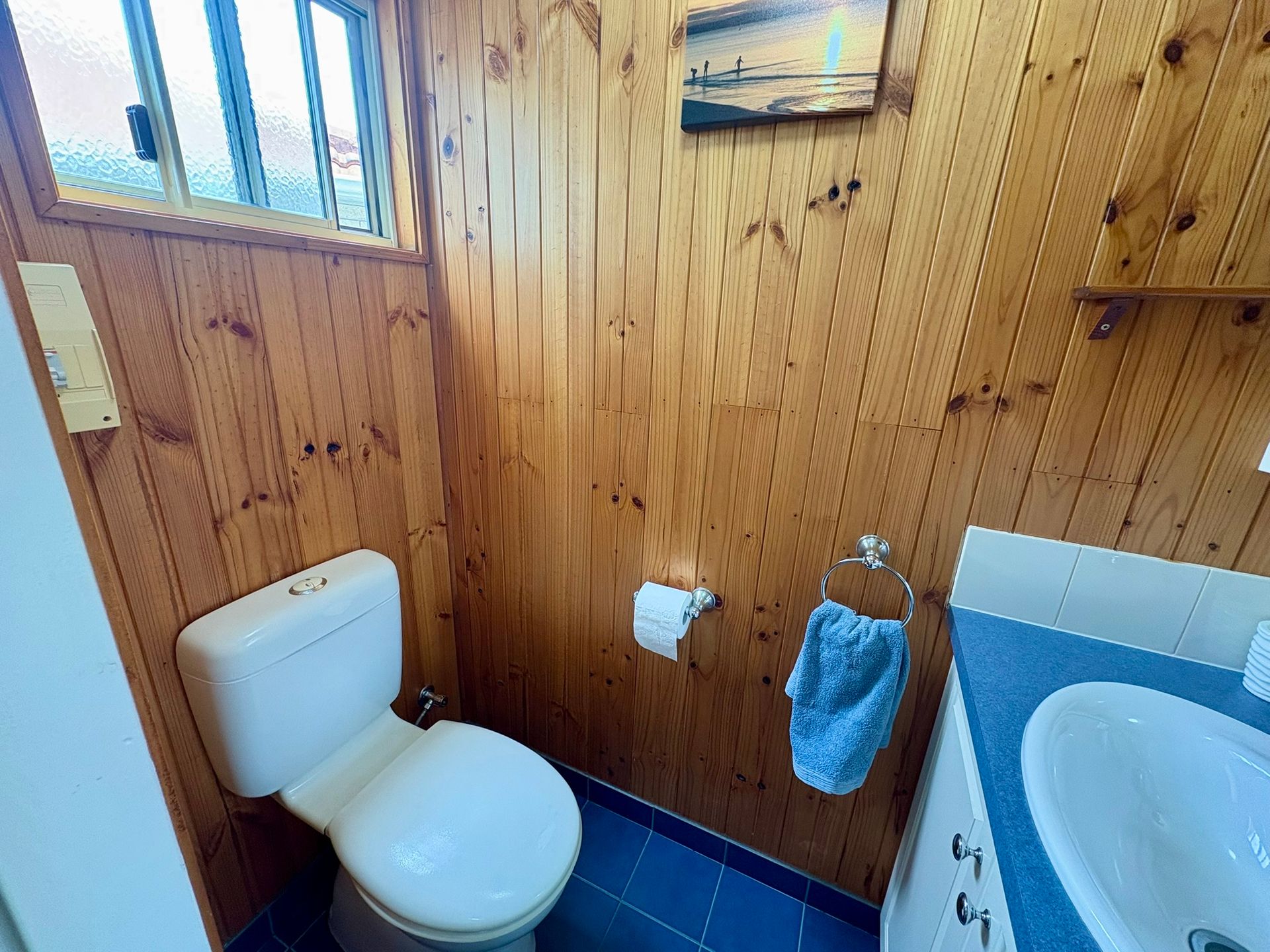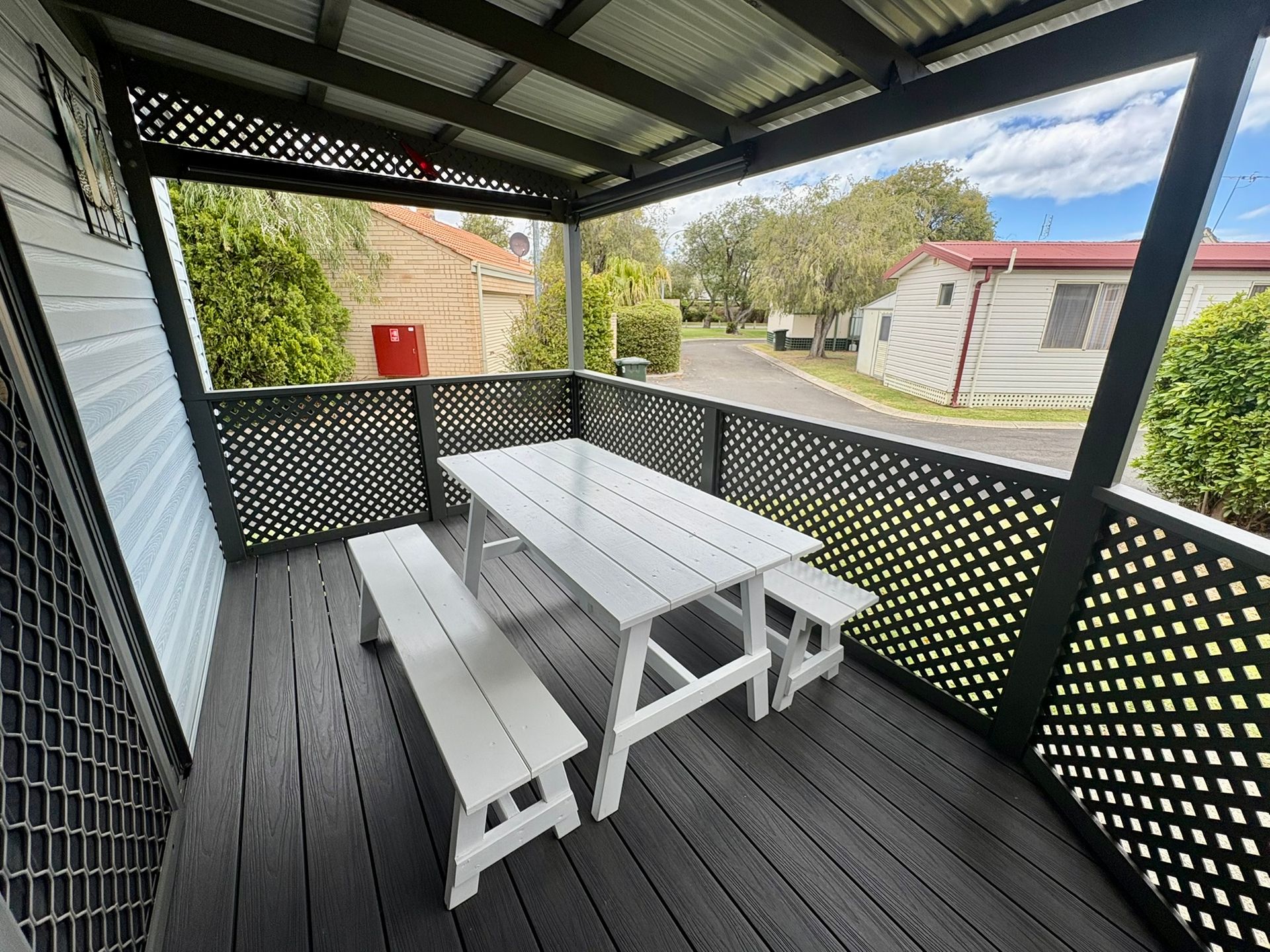 Step outside to the deck, furnished with outdoor seating and blinds so you can enjoy the fresh air in comfort. Just a few steps away is a brick ensuite-style building containing your private bathroom with a shower, toilet and a washing machine.
