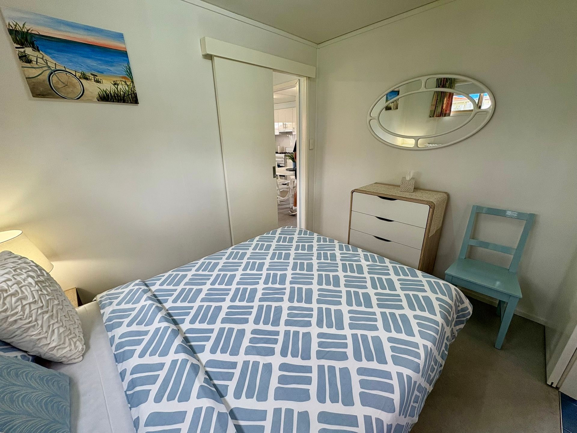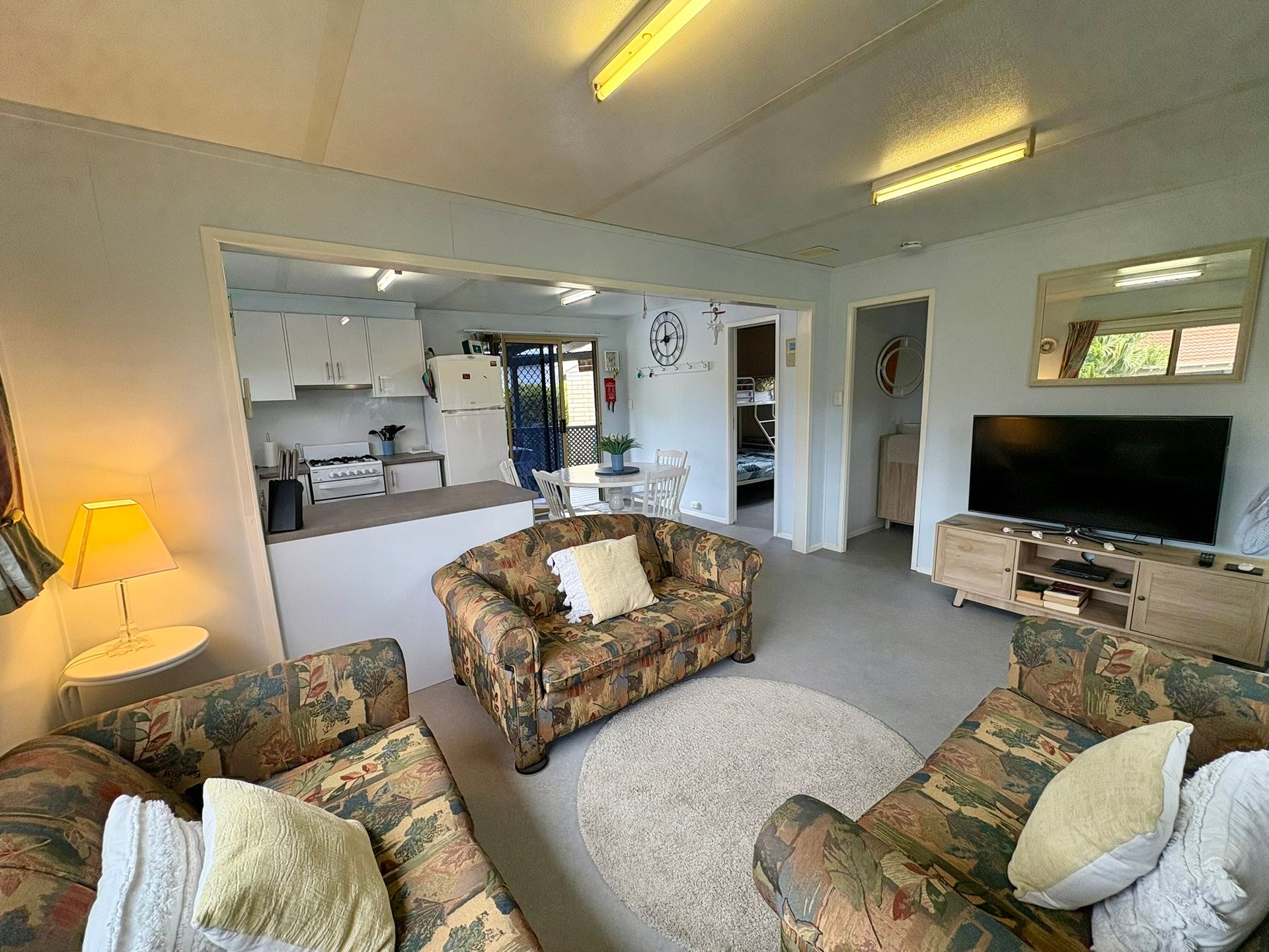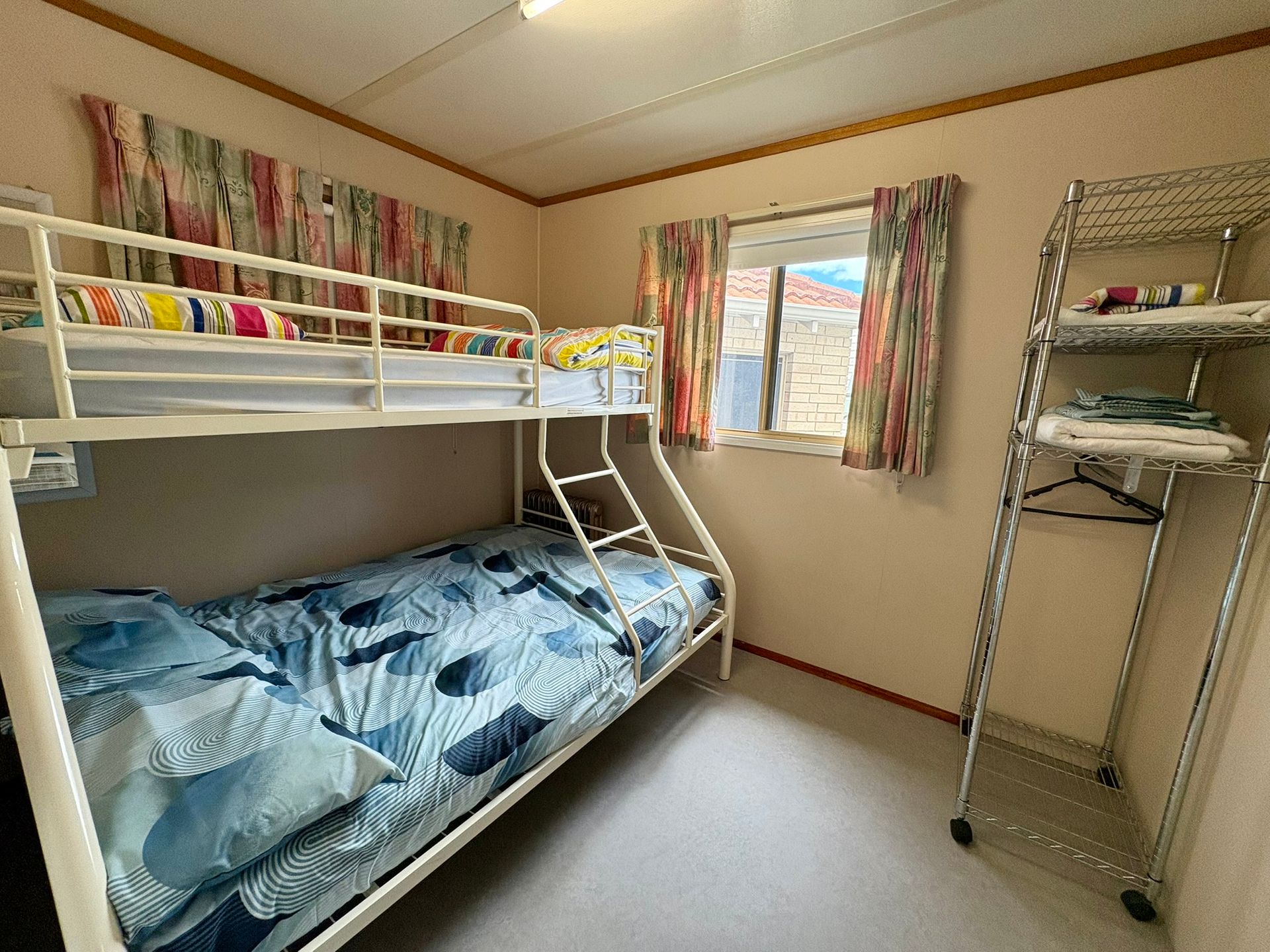 The main bedroom includes a double bed and has direct access to an internal toilet for added privacy. The second bedroom features a practical tri-bunk, ideal for kids or additional guests.