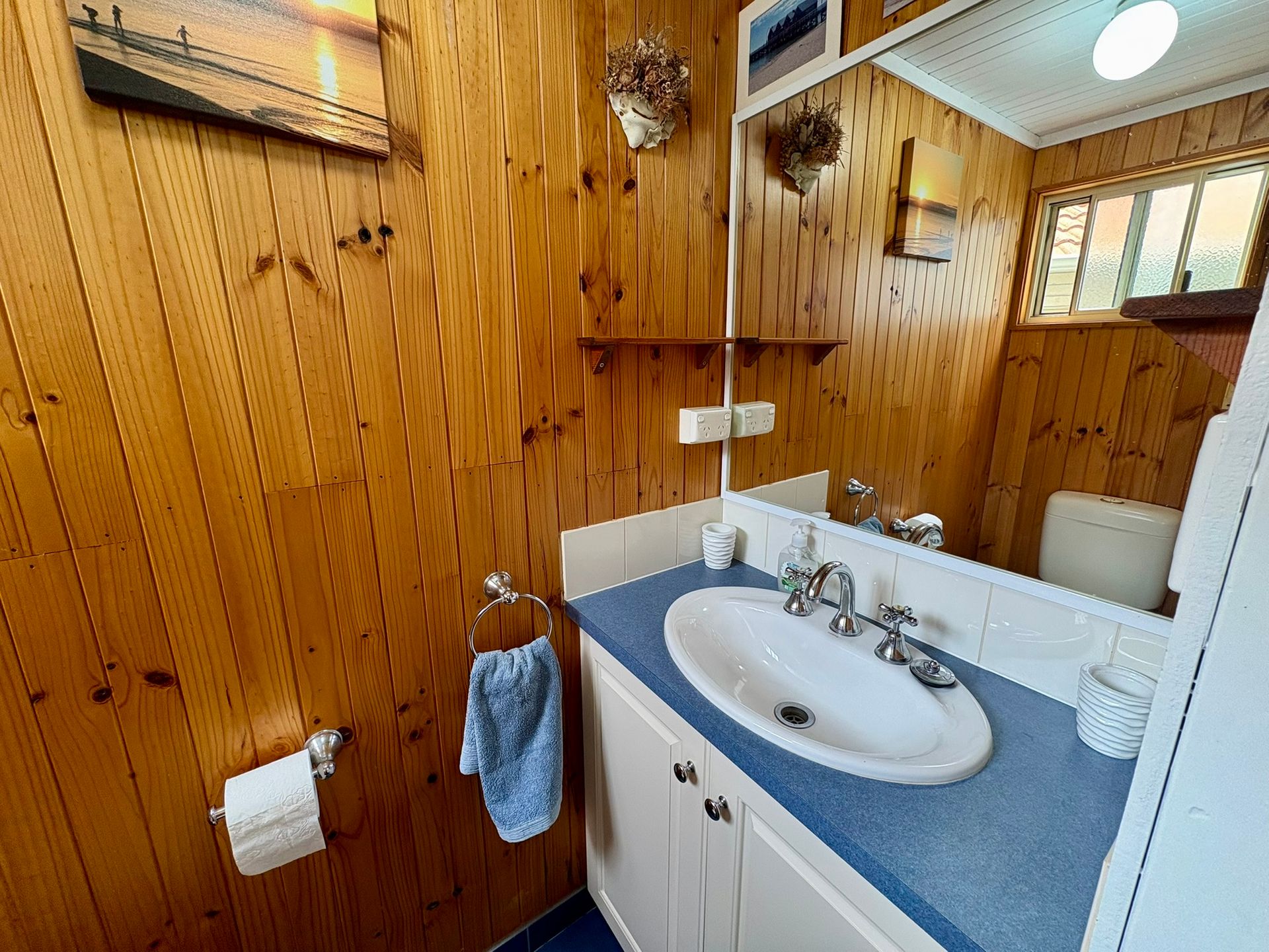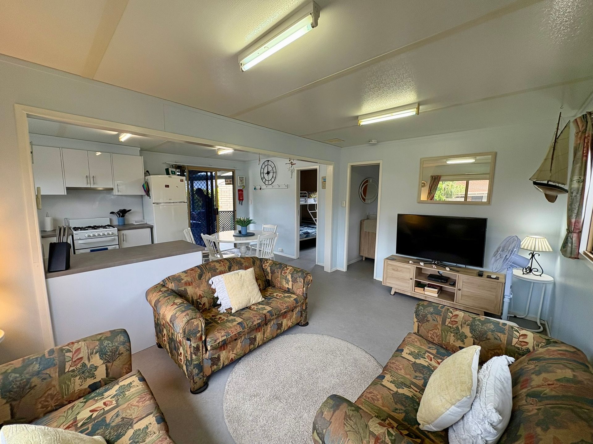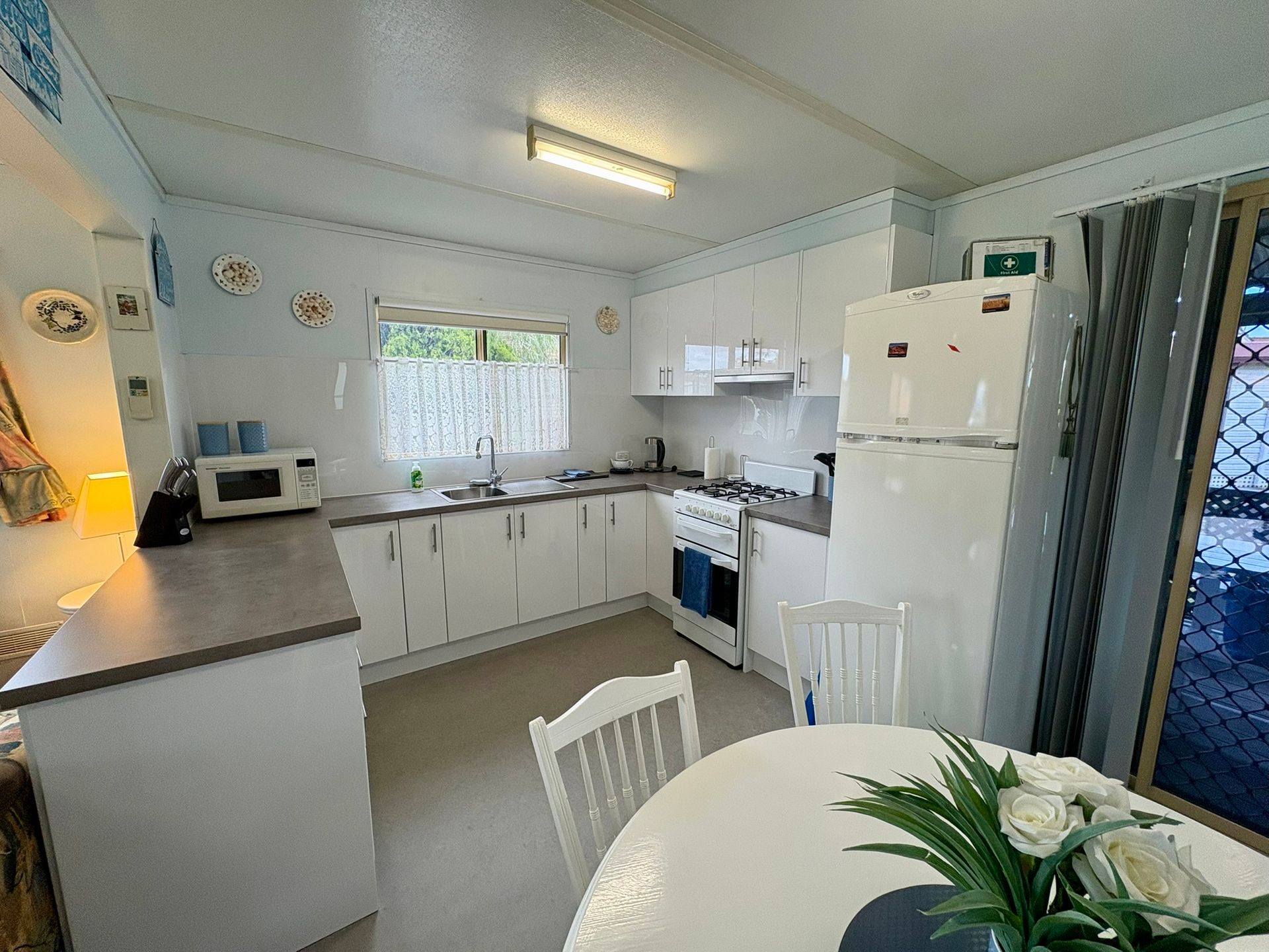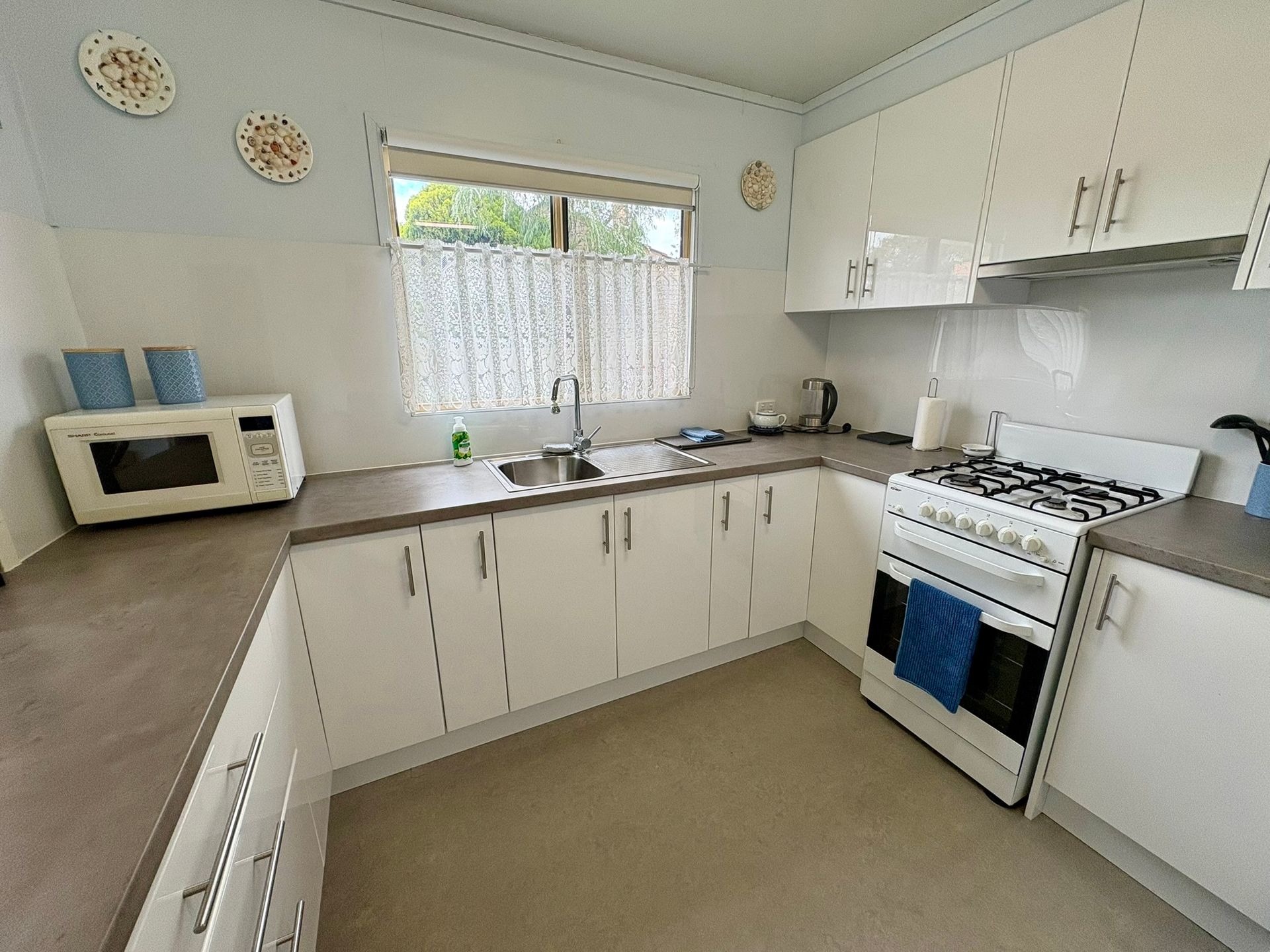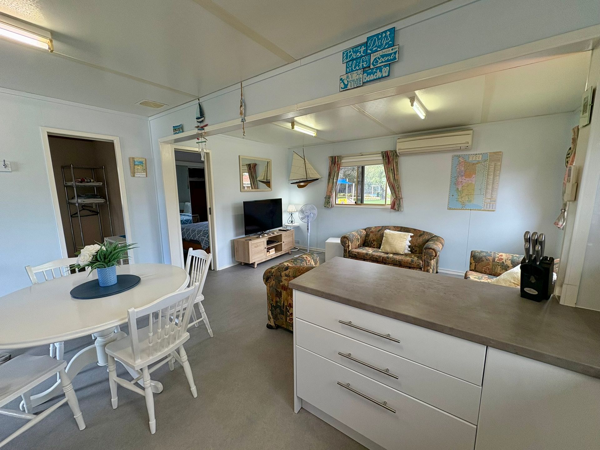The open-plan kitchen, dining and living area is set up for easy holiday living, complete with a TV and reverse-cycle air conditioning to keep you comfortable year-round. The kitchen is fully self-contained with all the essentials for preparing meals during your stay.