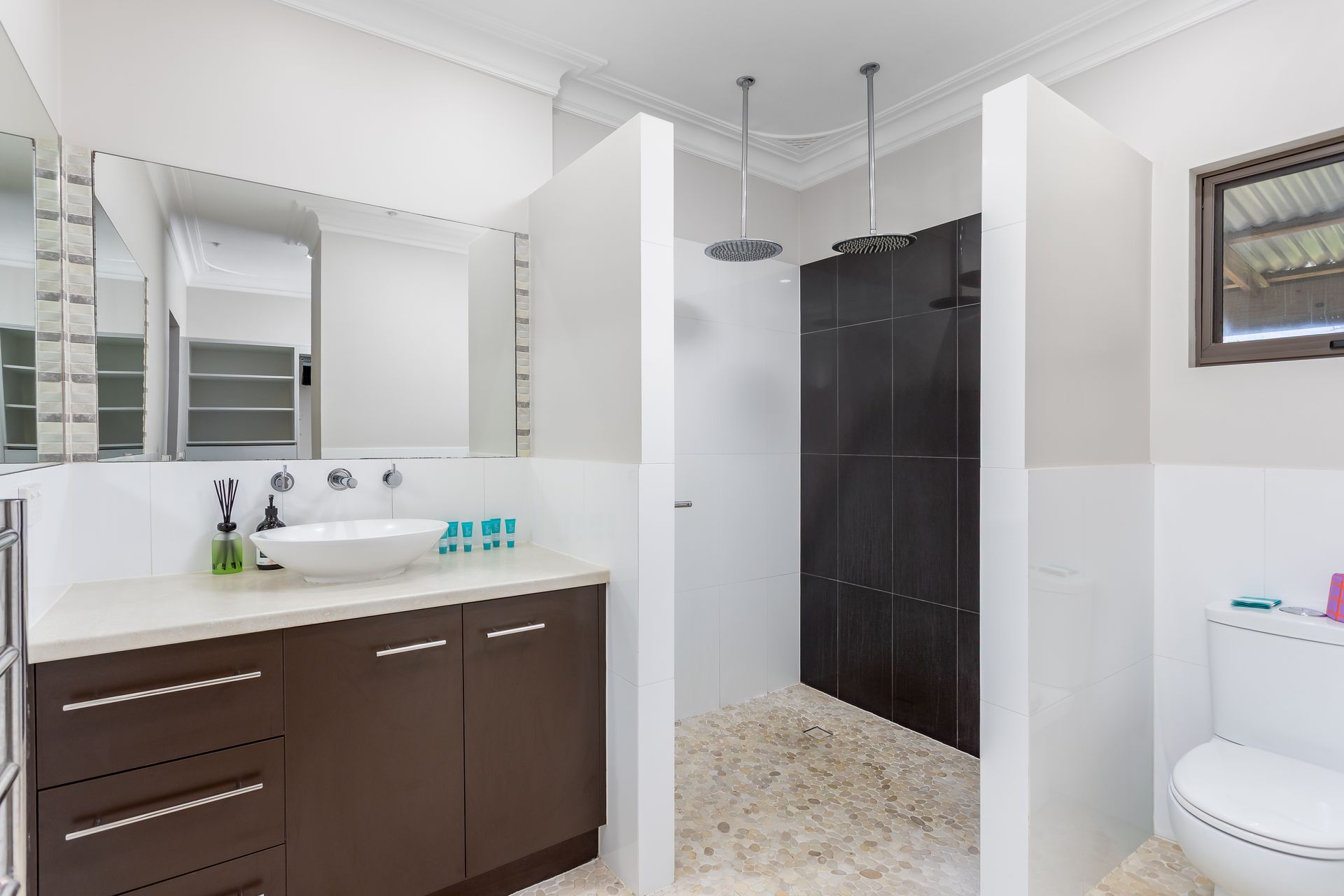 Inside, you’ll find a stylish open-plan living, dining, and kitchen area designed for relaxed holiday living. The master bedroom features a king bed, walk-in robe, and a luxurious ensuite with double shower. Bedrooms 2 and 3 each include a queen bed, while Bedroom 4 offers two single beds, making the home comfortable for groups of up to 8 guests.