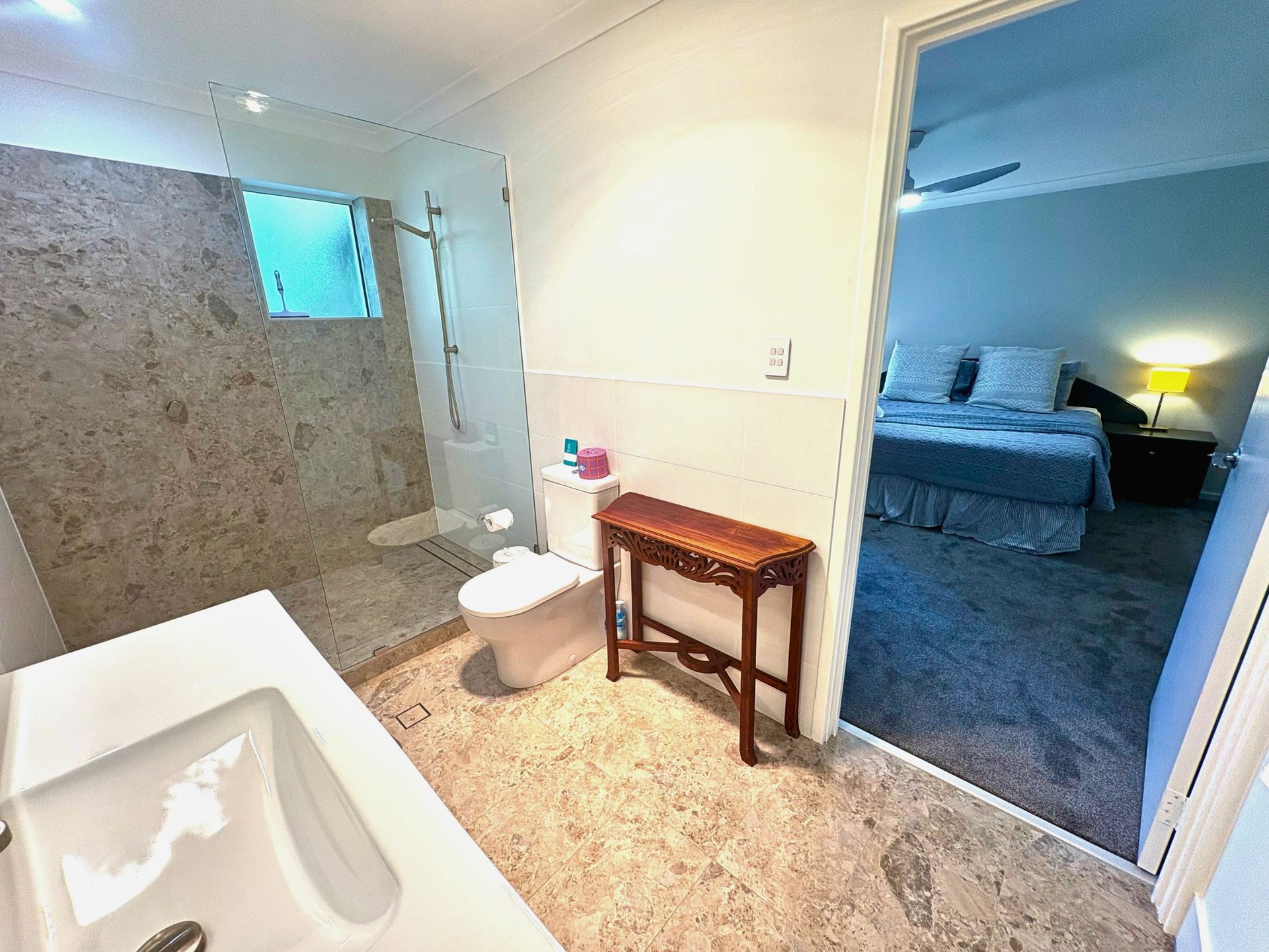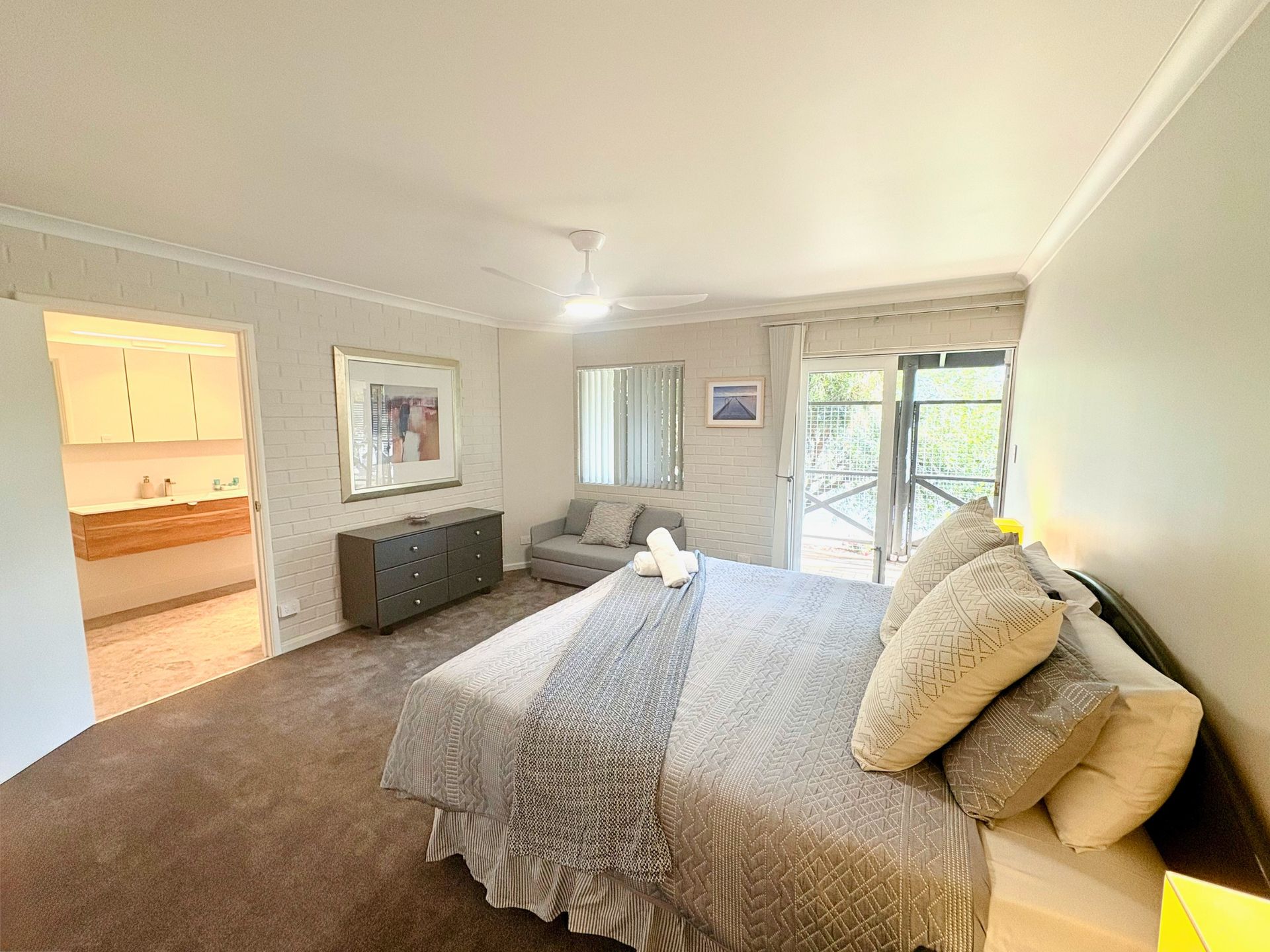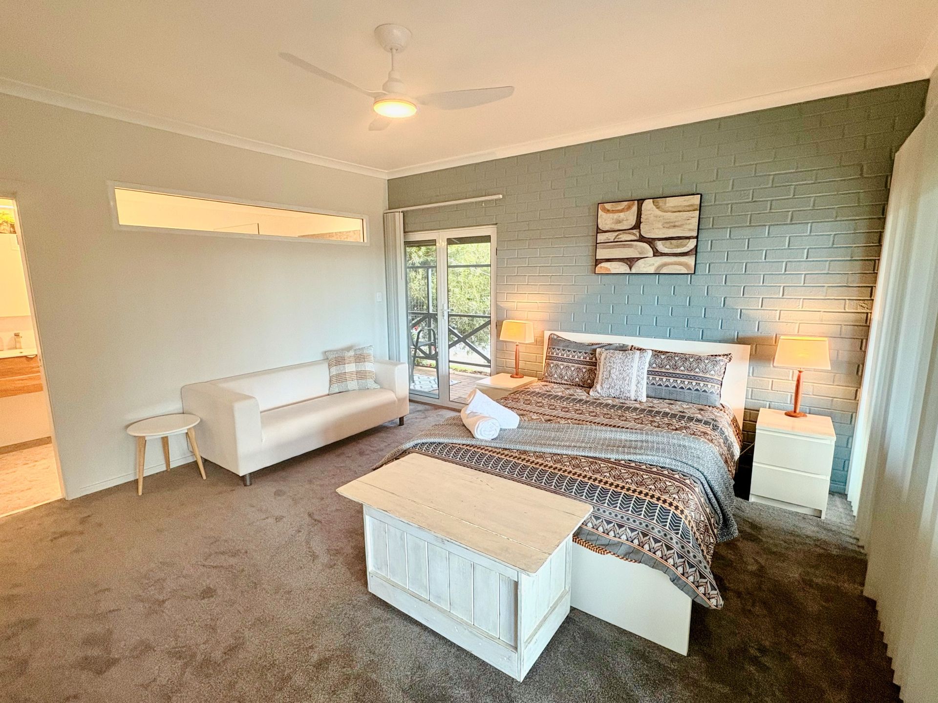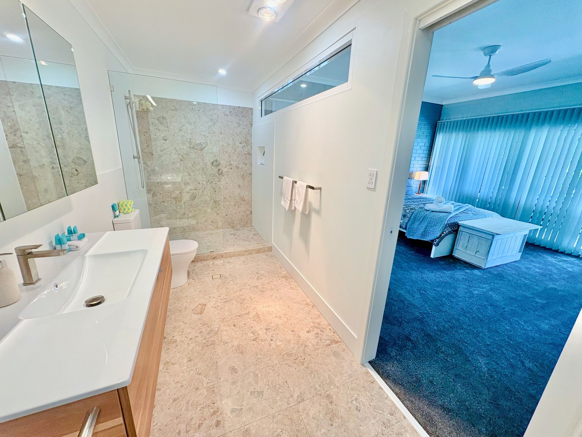 Bedroom 1 features a plush queen bed, private ensuite with a large walk-in shower, and bifold doors opening to your own patio lounge – ideal for slow mornings and sunset drinks.