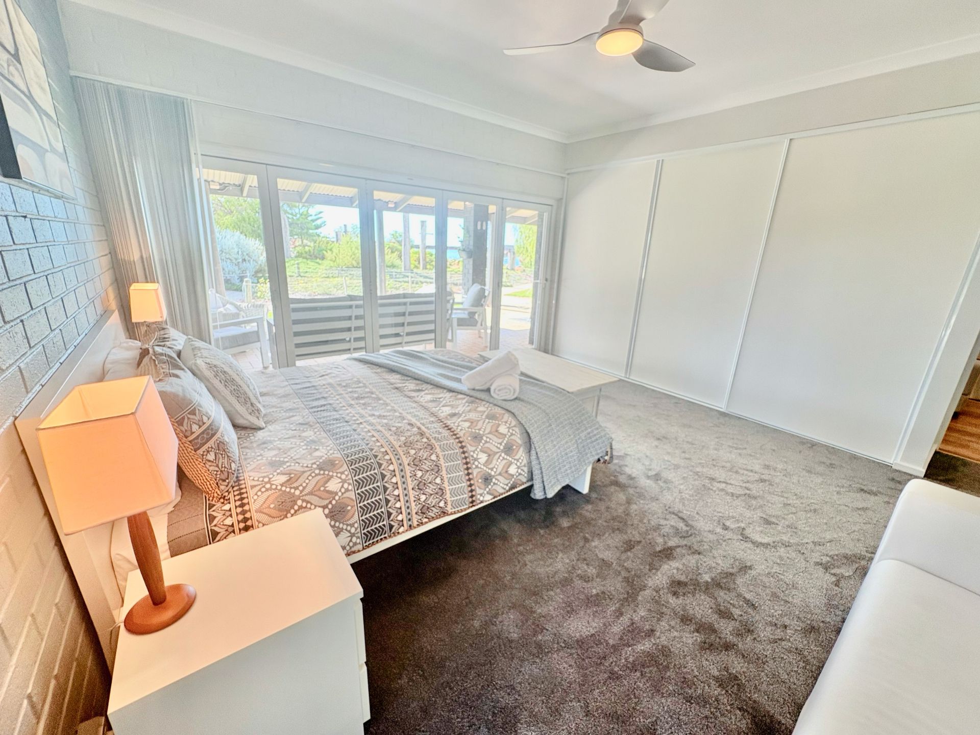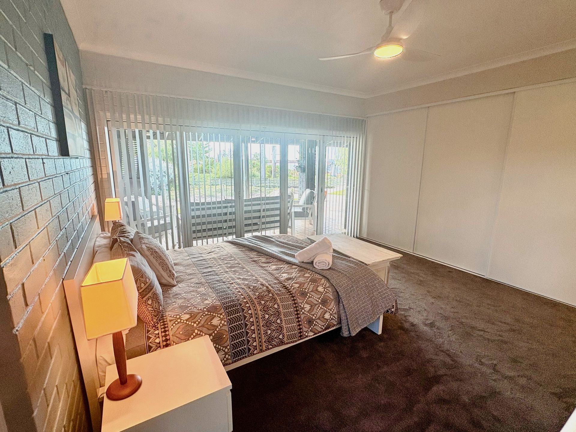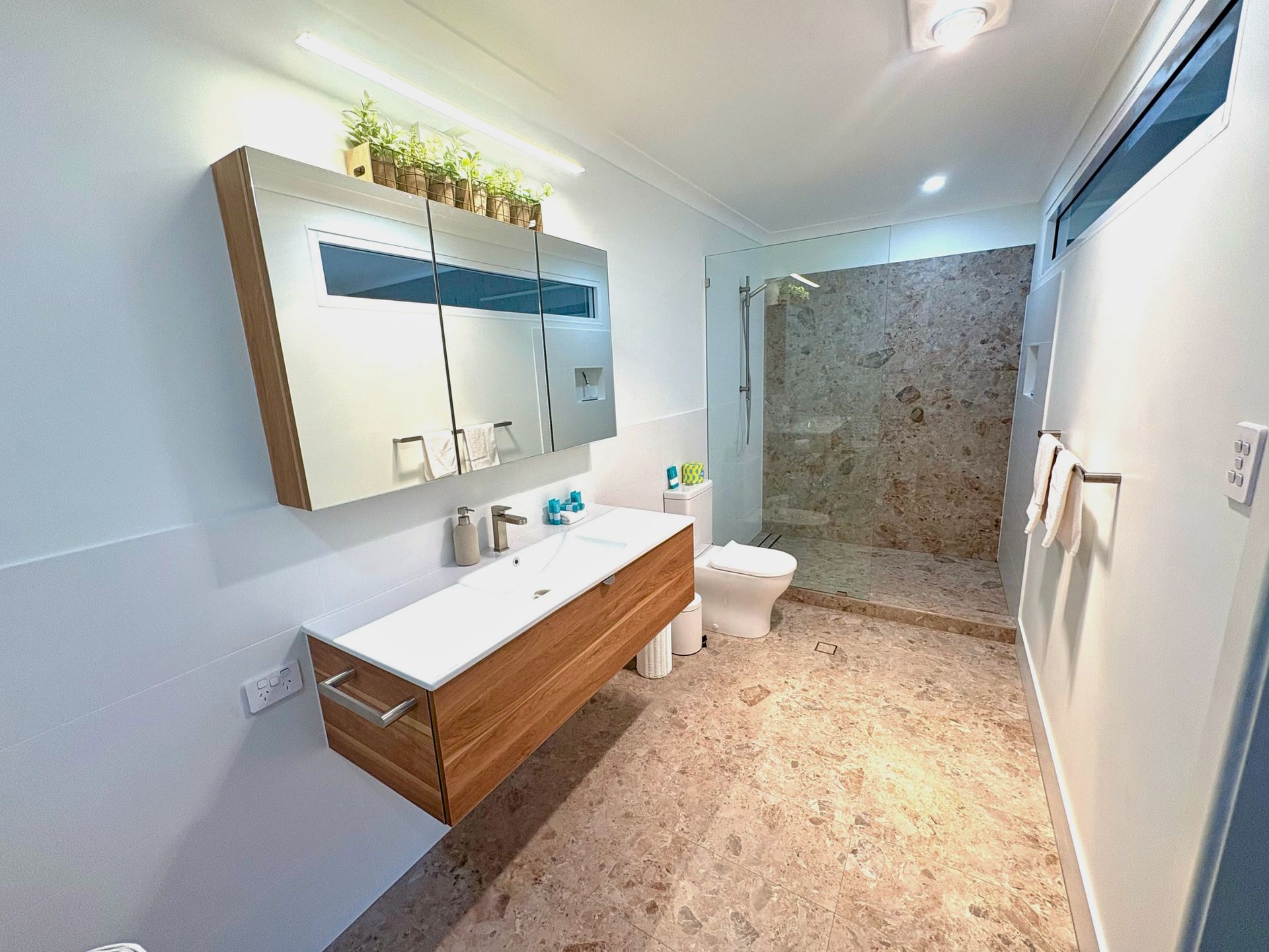 Bedroom 1 features a plush queen bed, private ensuite with a large walk-in shower, and bifold doors opening to your own patio lounge – ideal for slow mornings and sunset drinks.