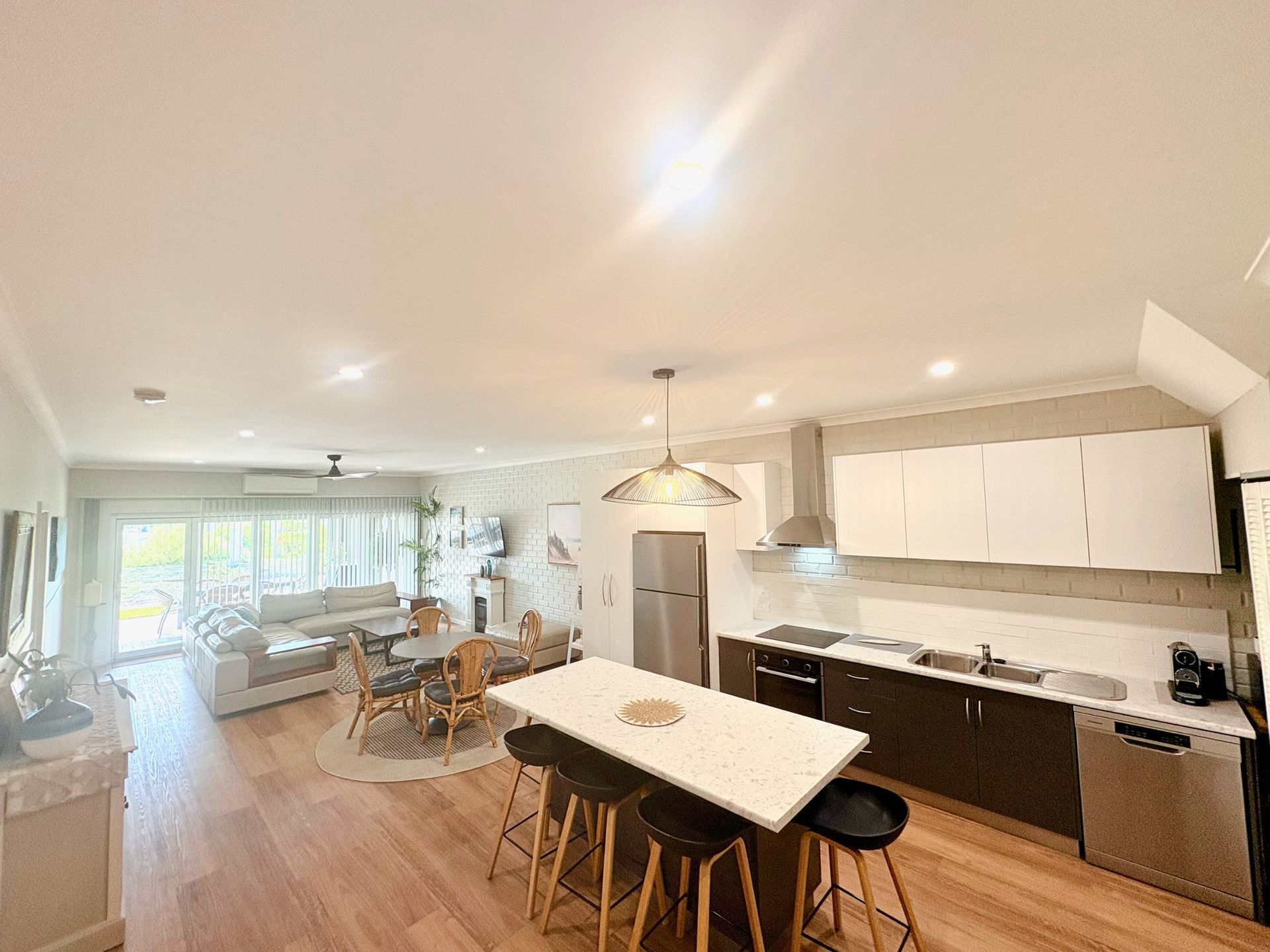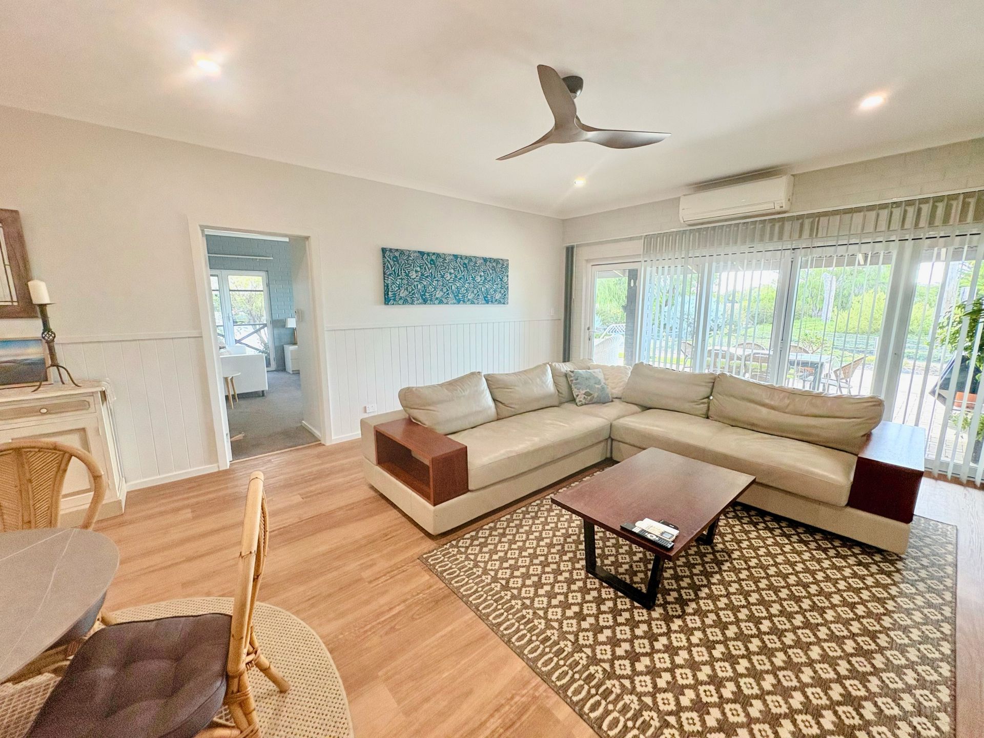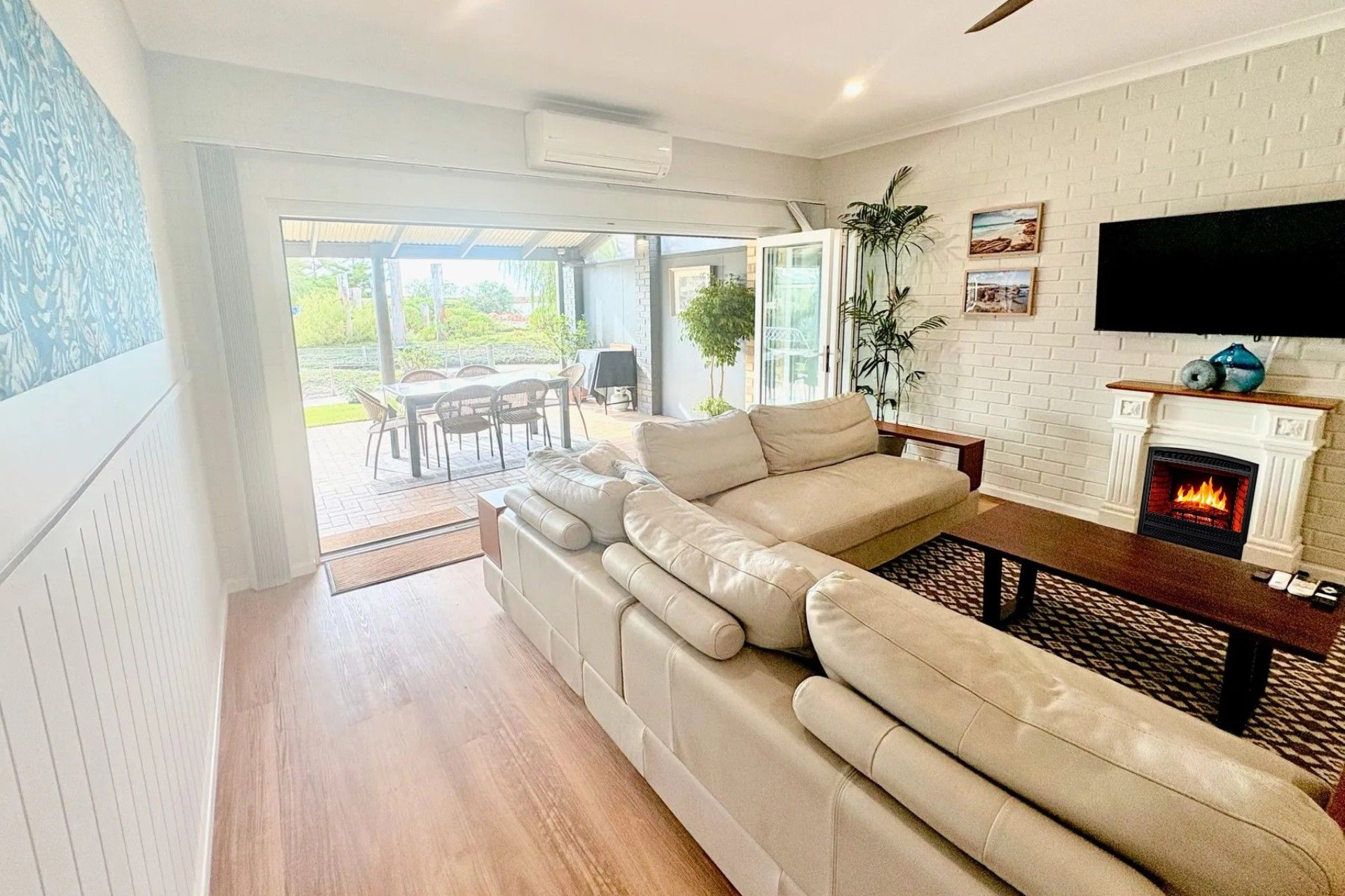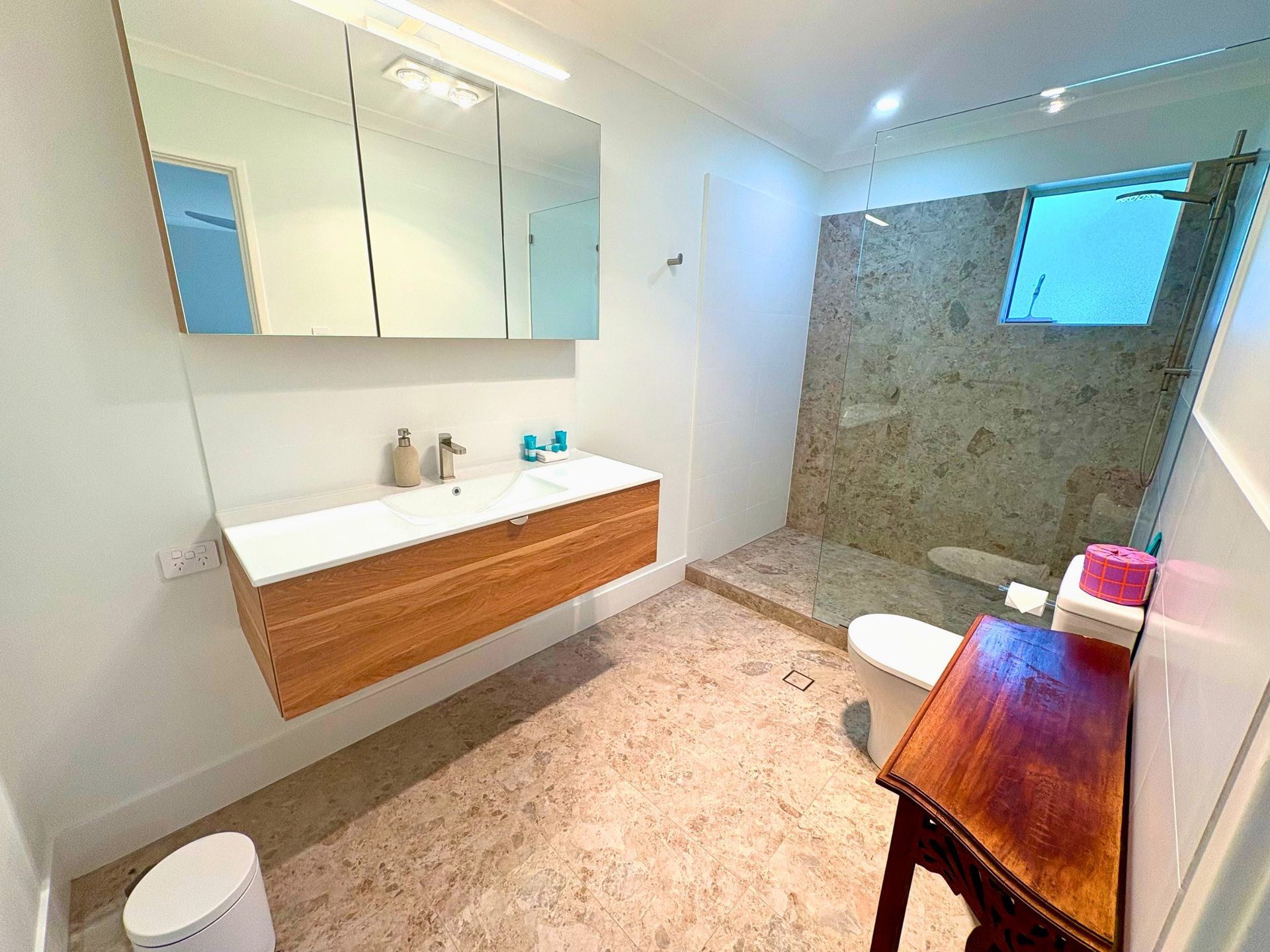 Bedroom 1 features a plush queen bed, private ensuite with a large walk-in shower, and bifold doors opening to your own patio lounge – ideal for slow mornings and sunset drinks.