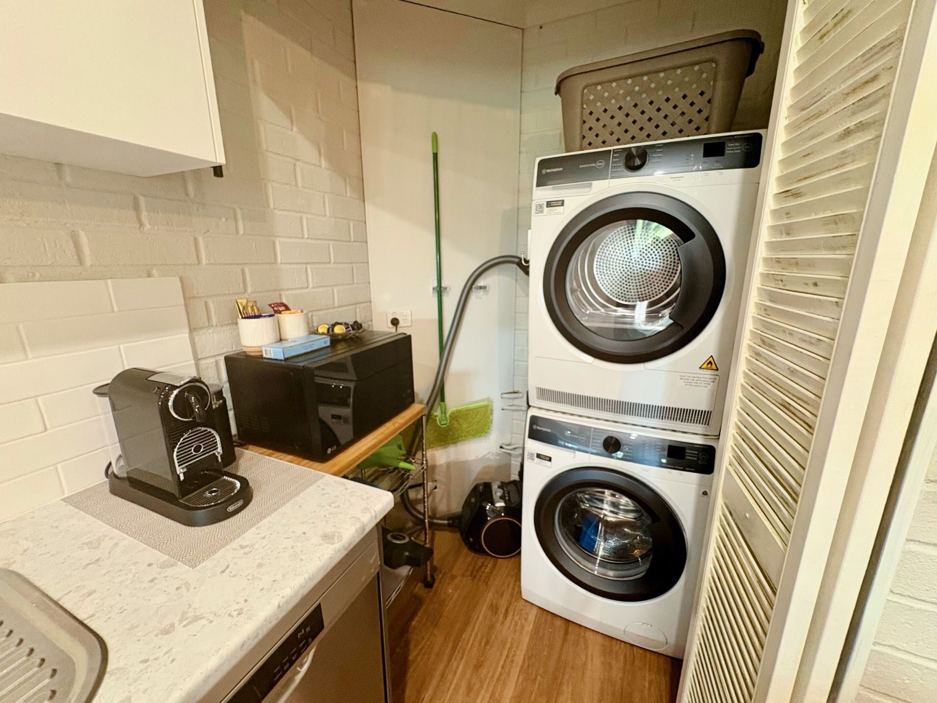 The fully equipped kitchen includes everything you need for a self-catered stay, including a coffee machine, quality appliances, and even a compact laundry nook with washer and dryer for added convenience.