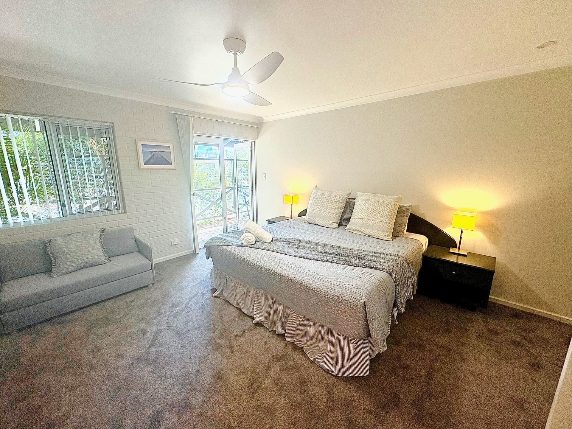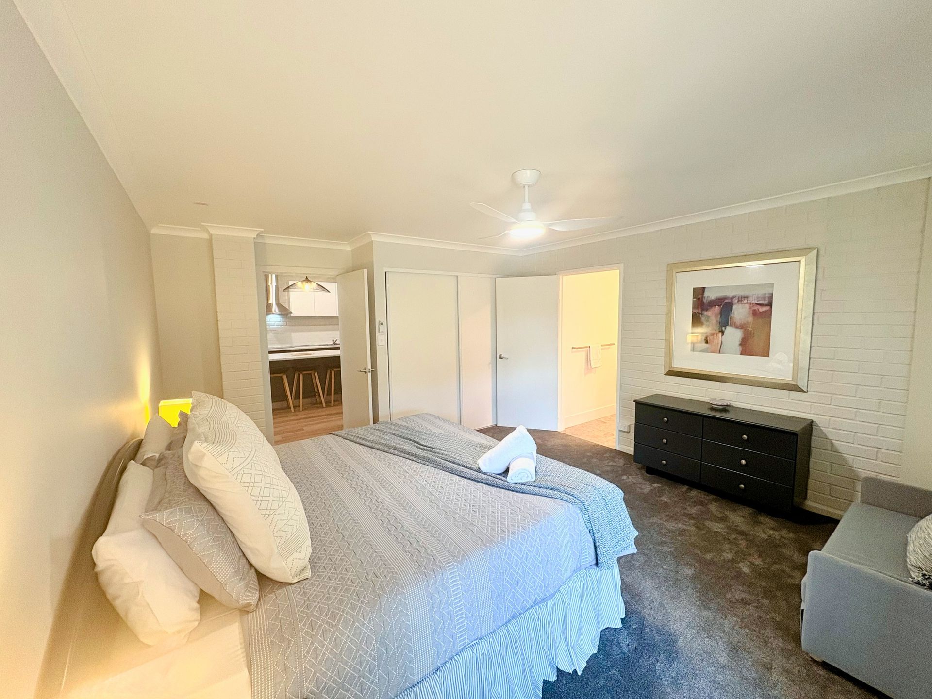 Bedroom 2 offers flexible sleeping arrangements with a king bed that can be converted into two king singles (upon request) and opens to a quiet side patio.