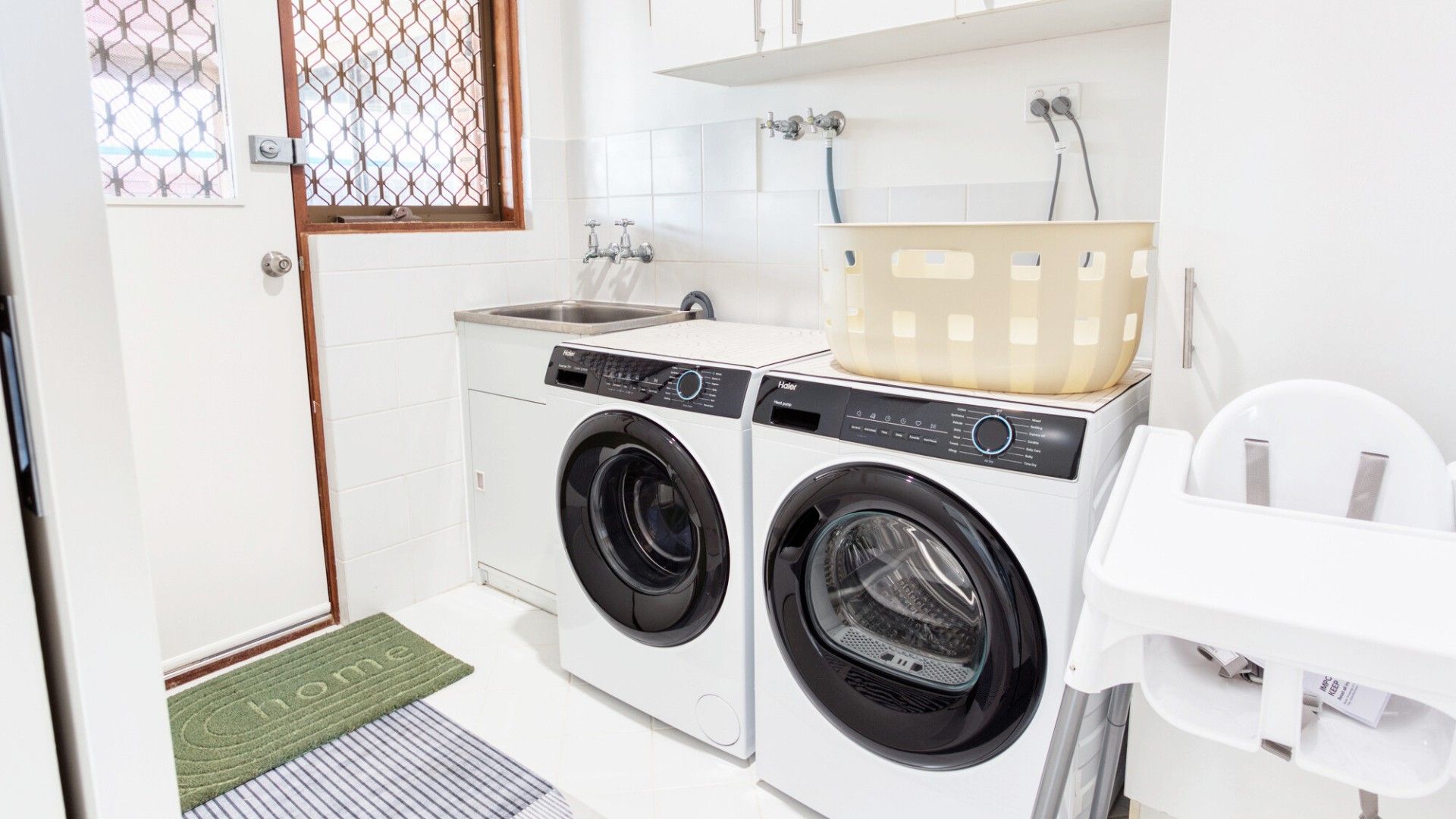 - Laundry with washing machine, dryer, ironing facilities, and highchair