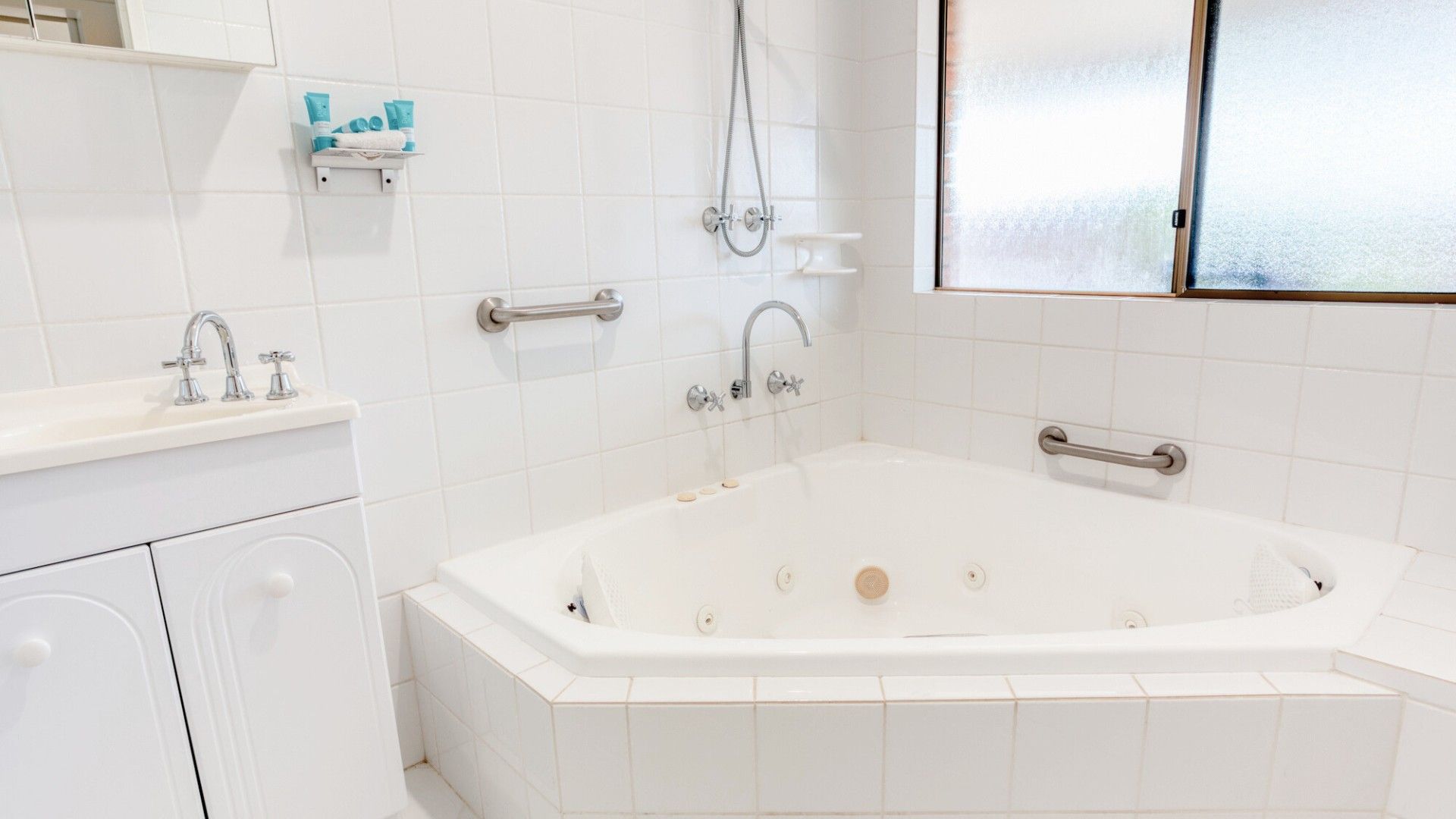 - Family bathroom with relaxing corner spa bath and separate toilet