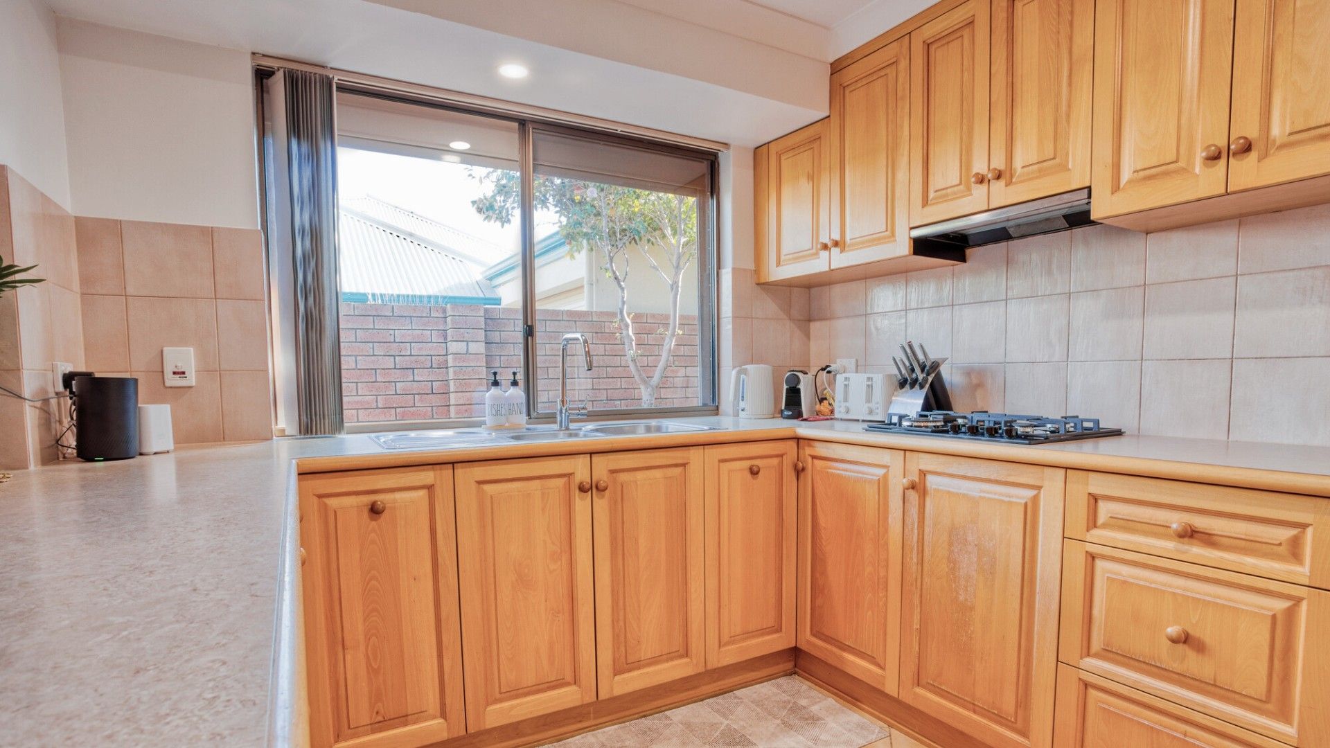 - Kitchen with gas stove (note: no dishwasher)