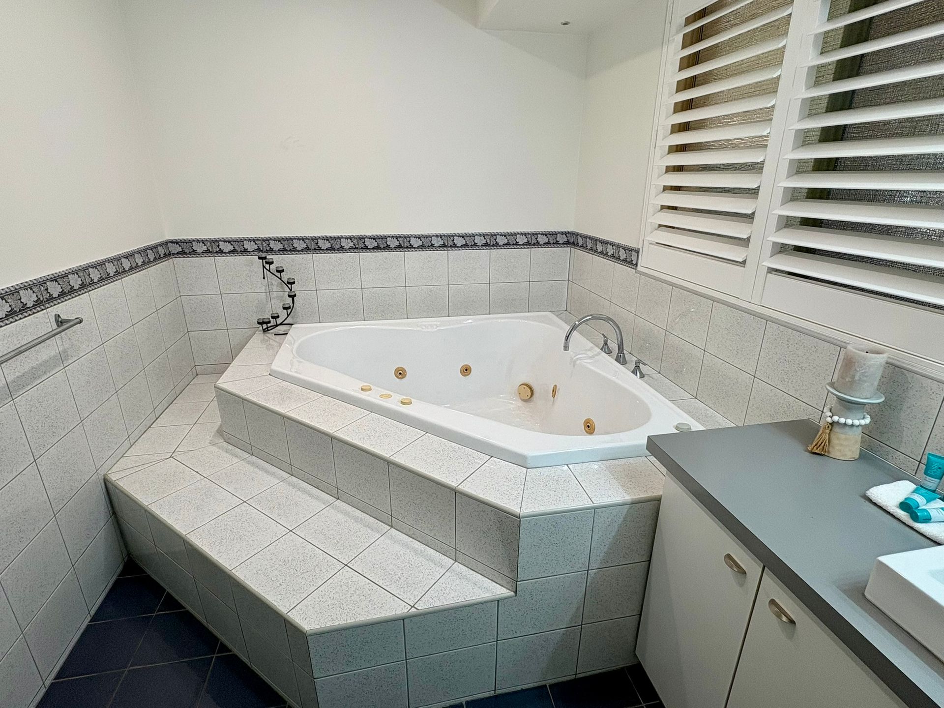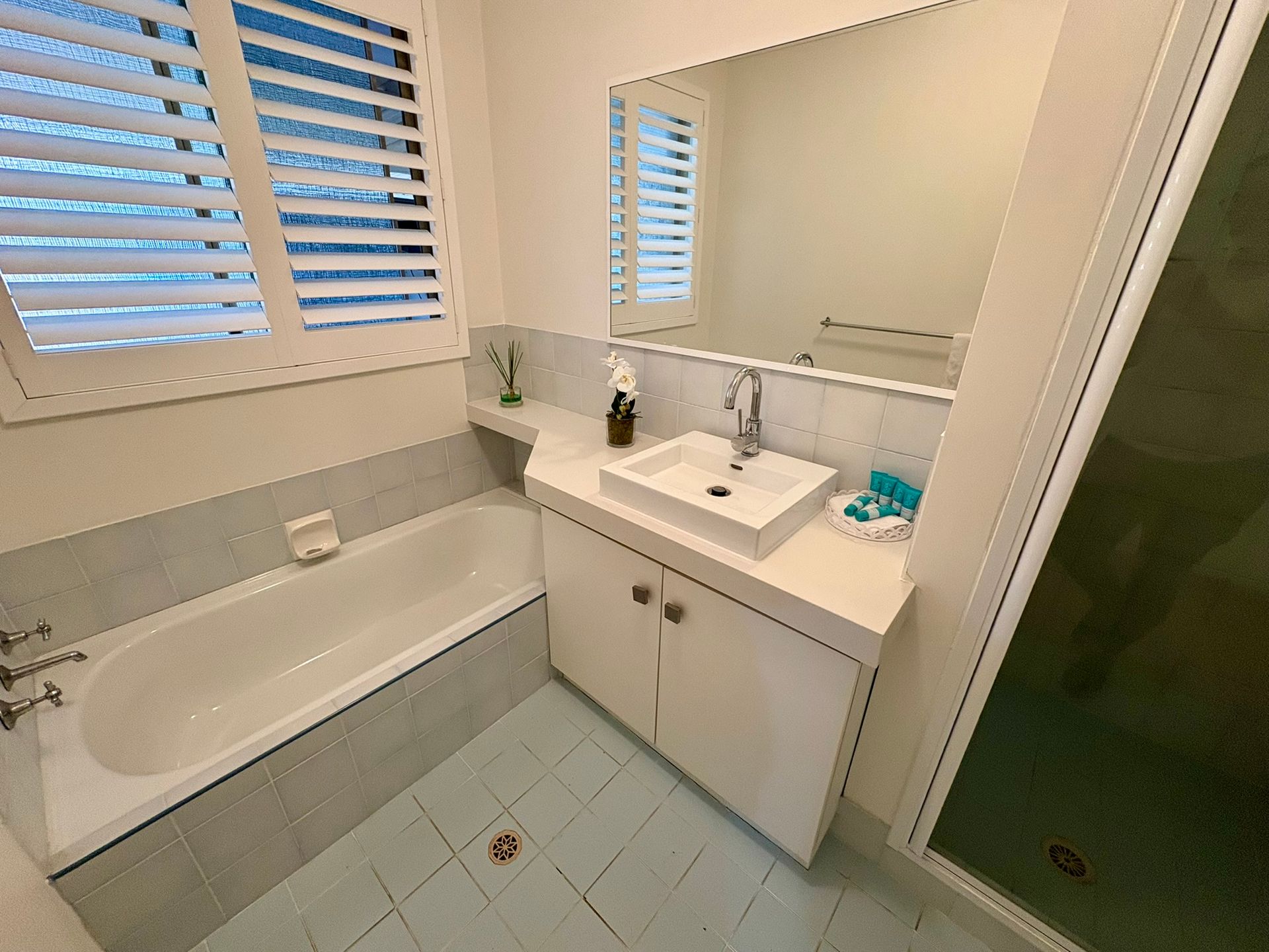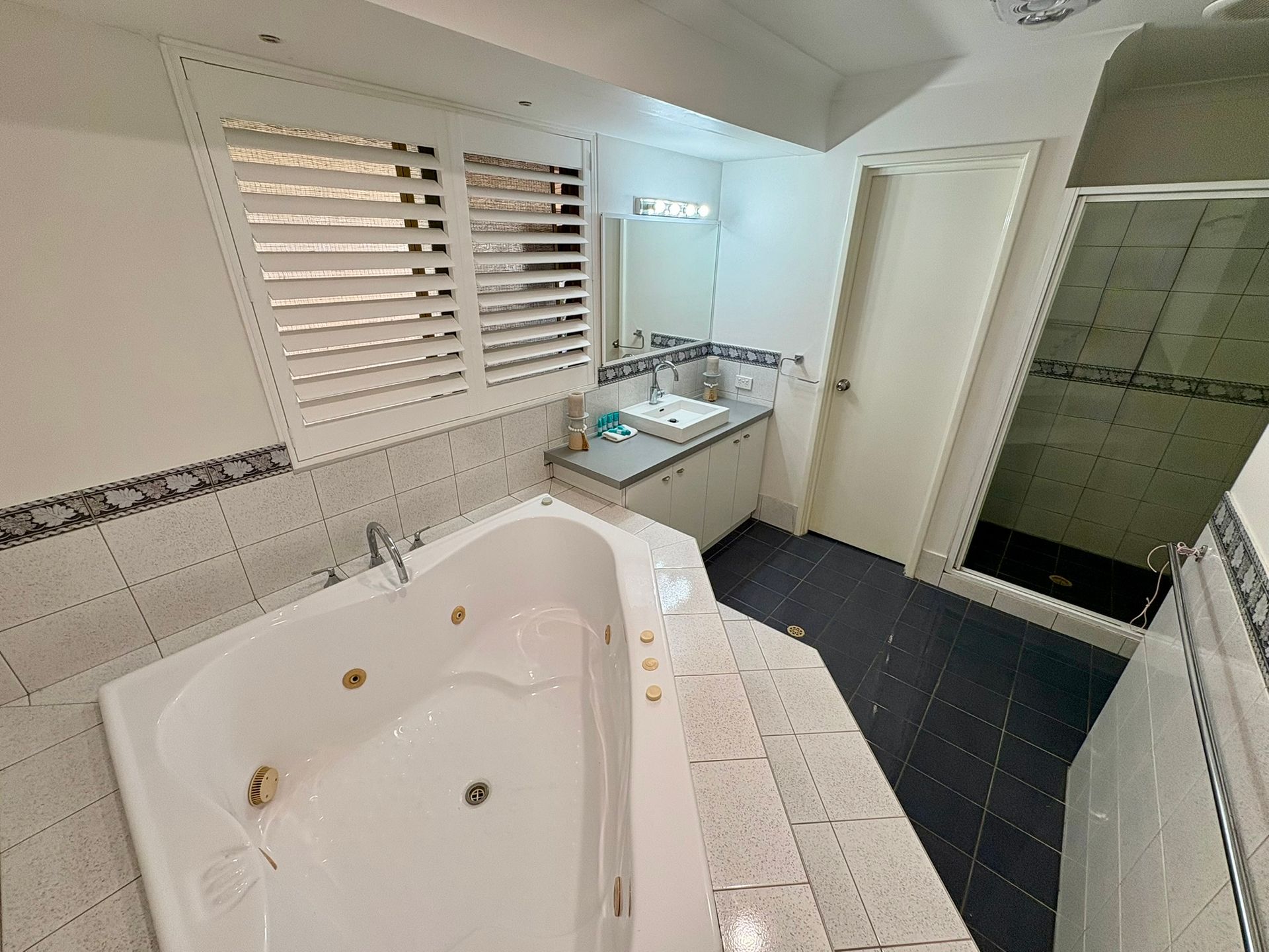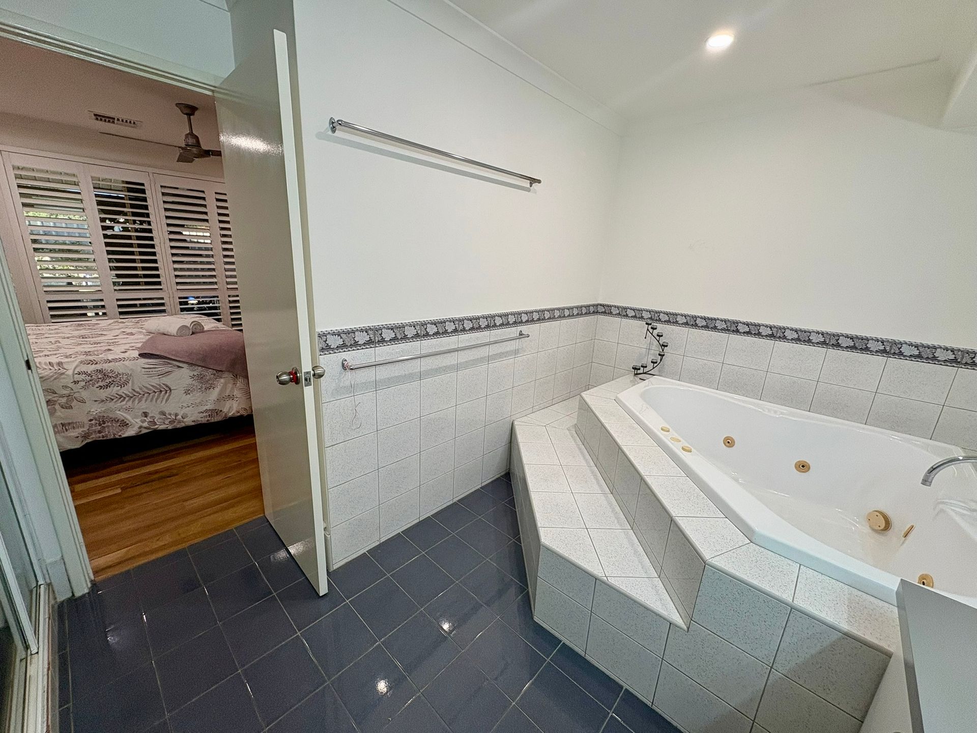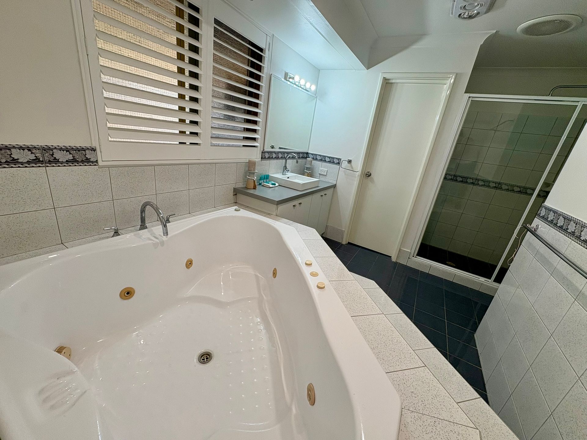 Inside, you'll find two generous bedrooms, both with queen beds, including a luxurious master suite with a large ensuite bathroom featuring a corner spa bath, separate shower, and private toilet. The second bedroom is serviced by a family bathroom with both a separate bath and shower, plus an additional separate toilet for convenience.