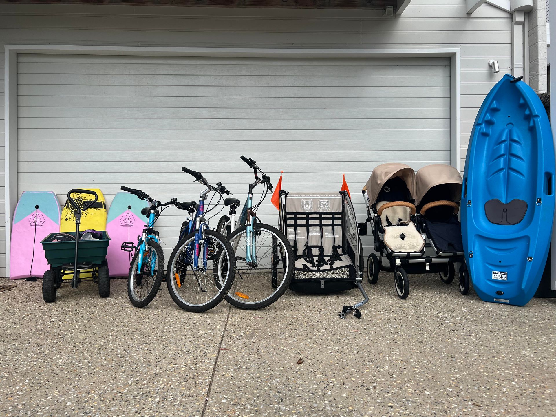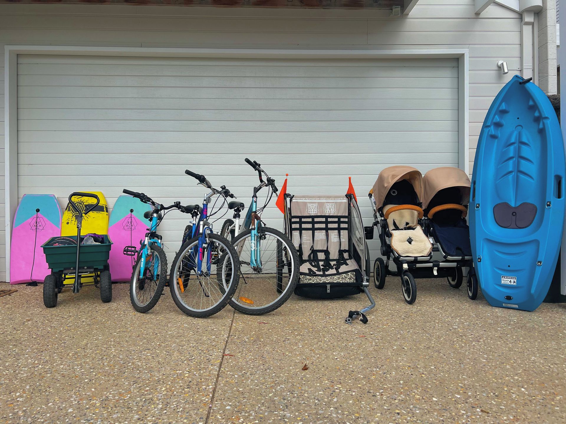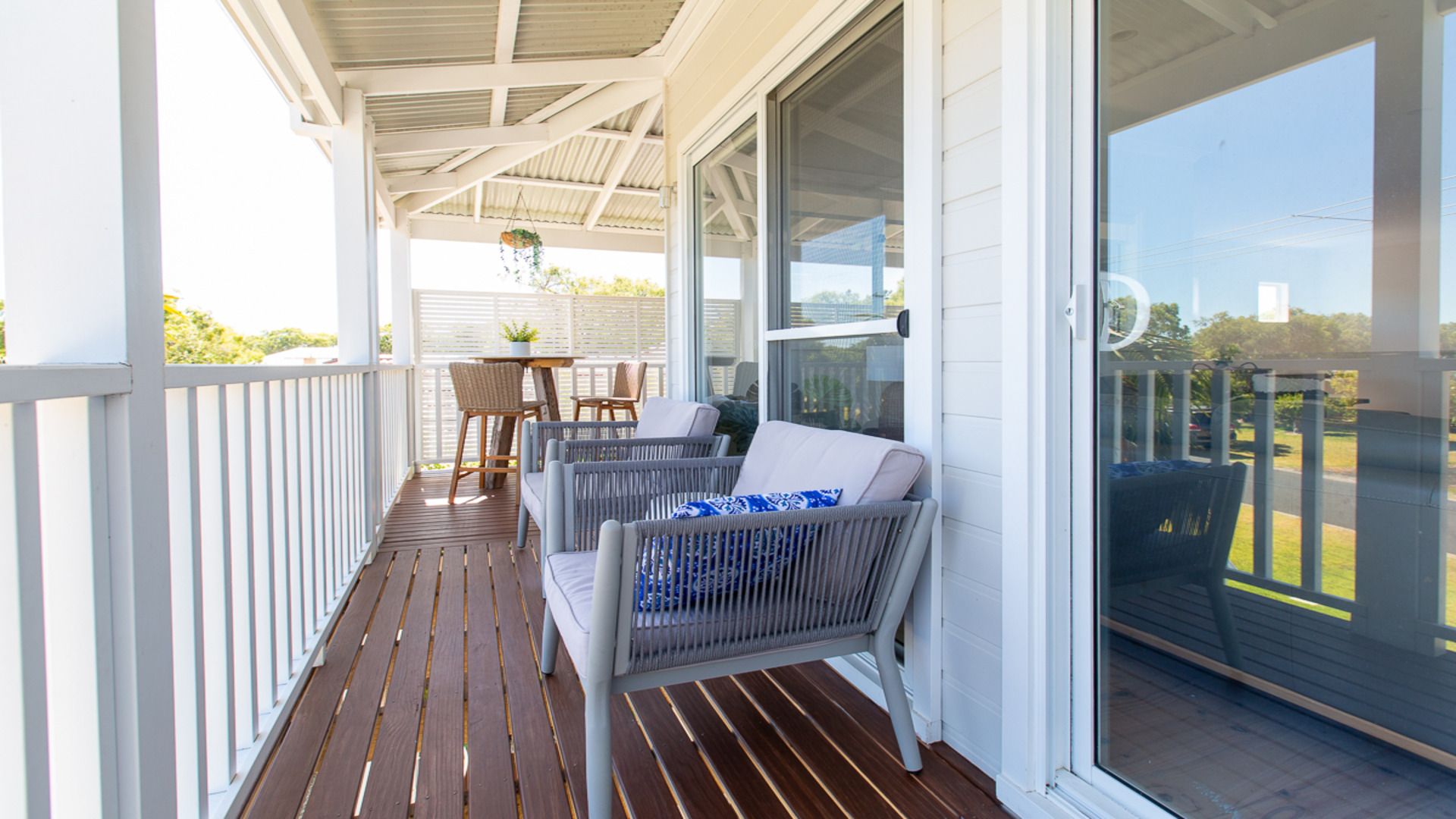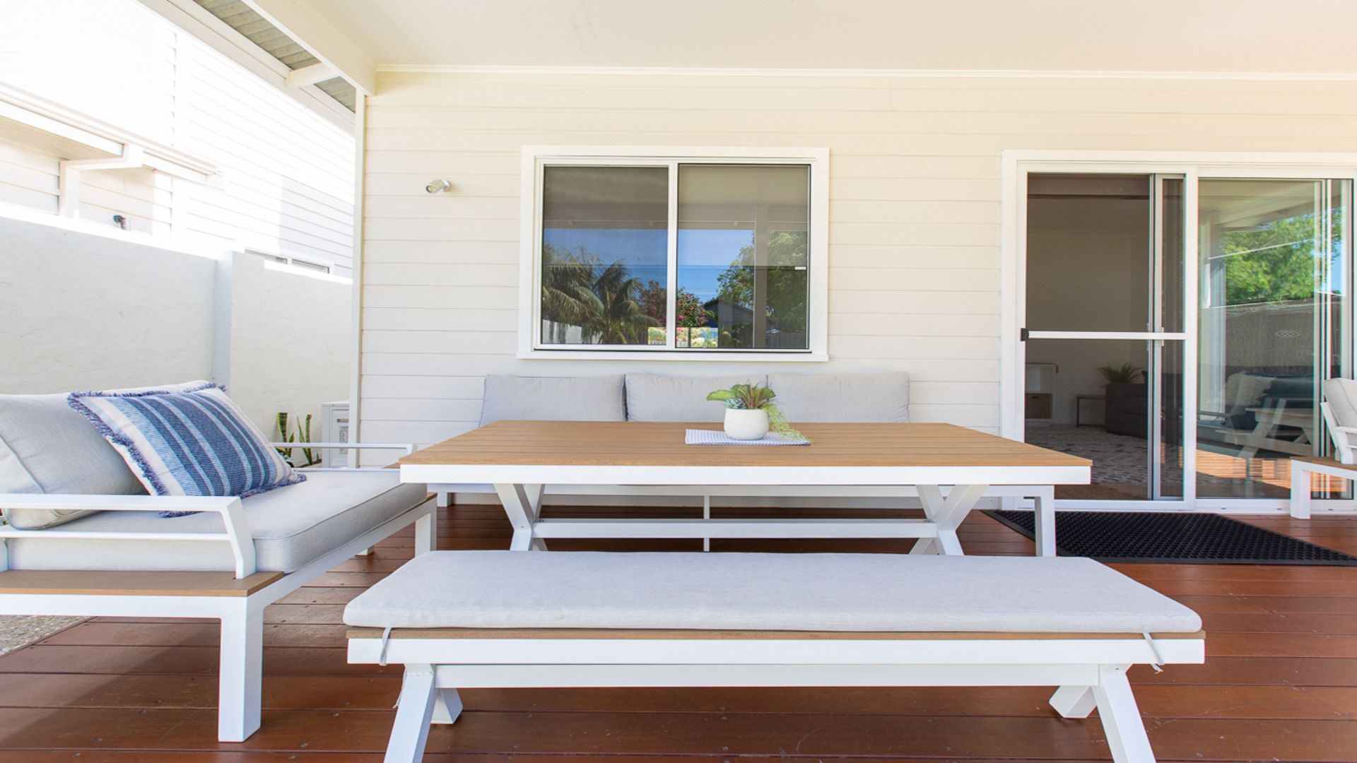 The outdoor space at Sunny Shores features comfortable outdoor furniture and a garage, providing a tranquil setting or a safe place for your vehicles. While we allow guests to use bikes, prams, and beach supplies stored in the garage, please note that parking in the garage is not permitted.