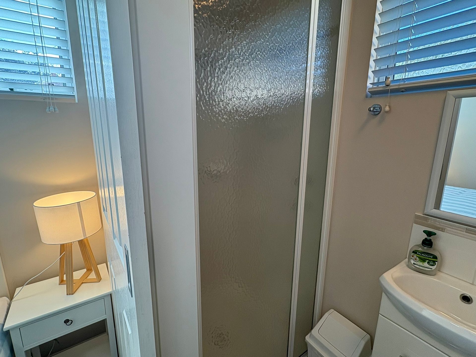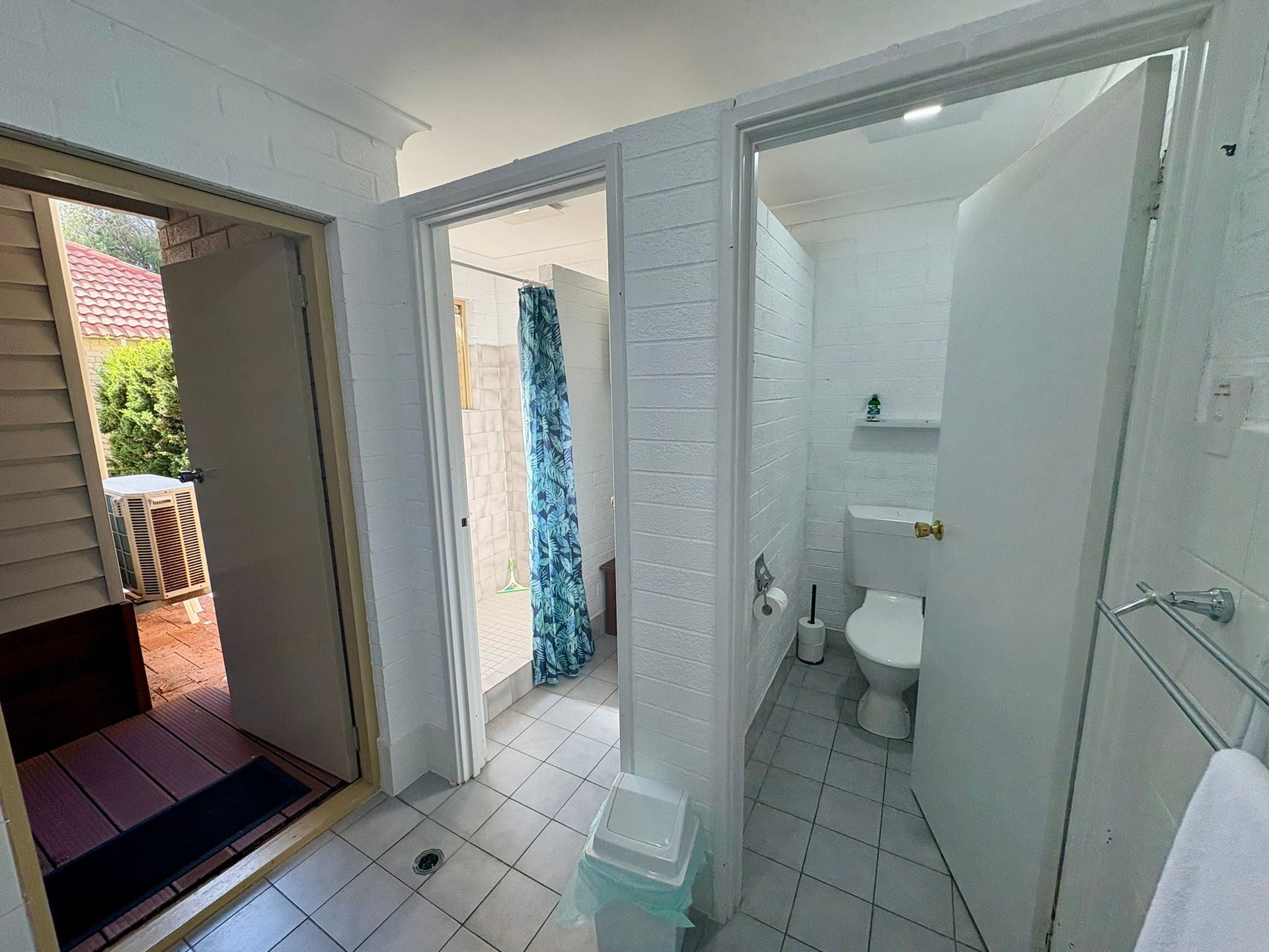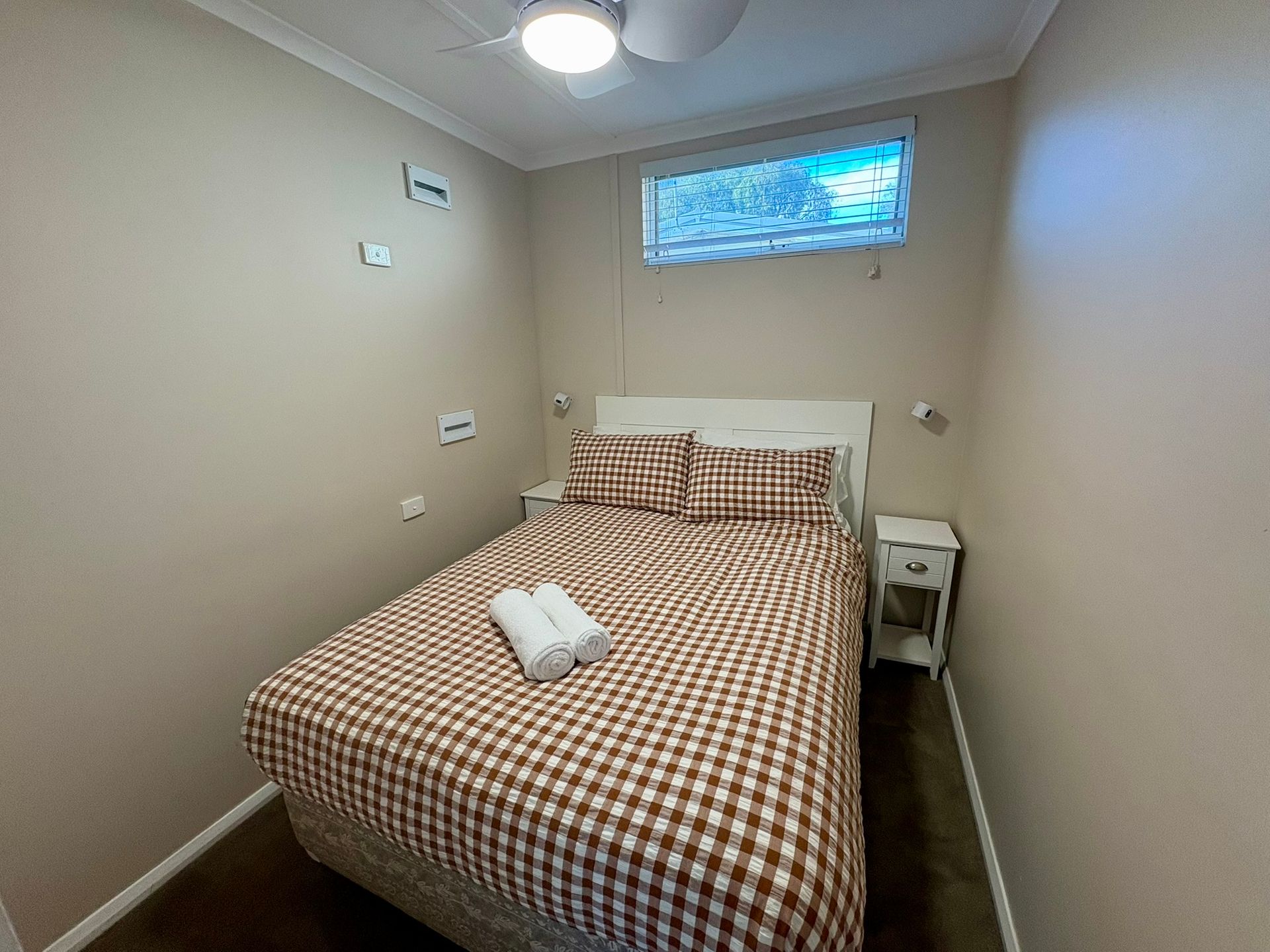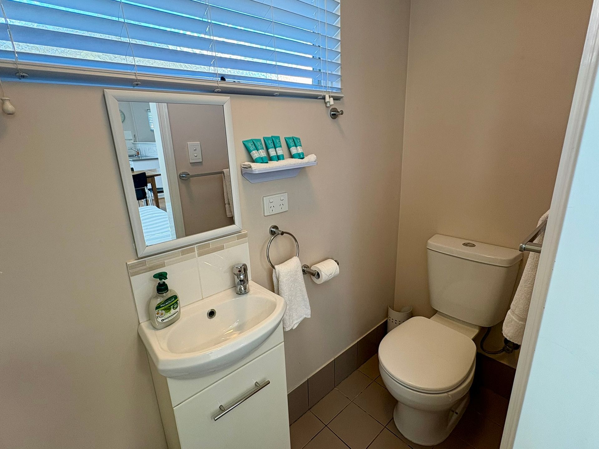 The master bedroom features a queen bed and a unique private ensuite with shower and toilet, while the second bedroom offers a cosy double bed. A family bathroom is located in the adjacent brick amenities building, exclusively for guest use, and includes a separate shower and toilet, plus a washer and dryer for added convenience.