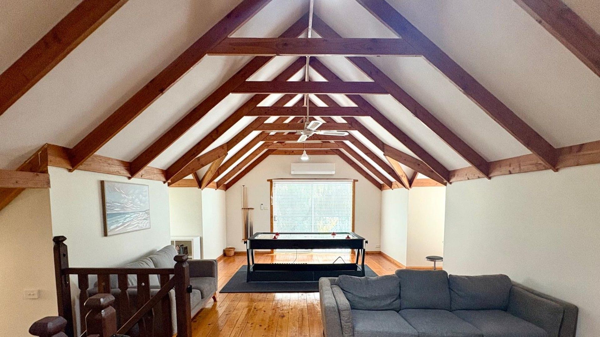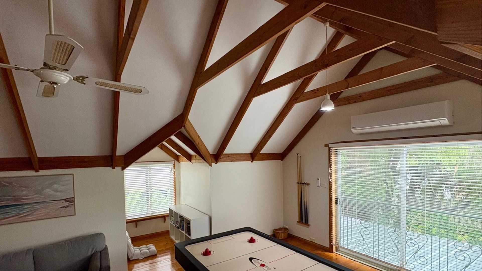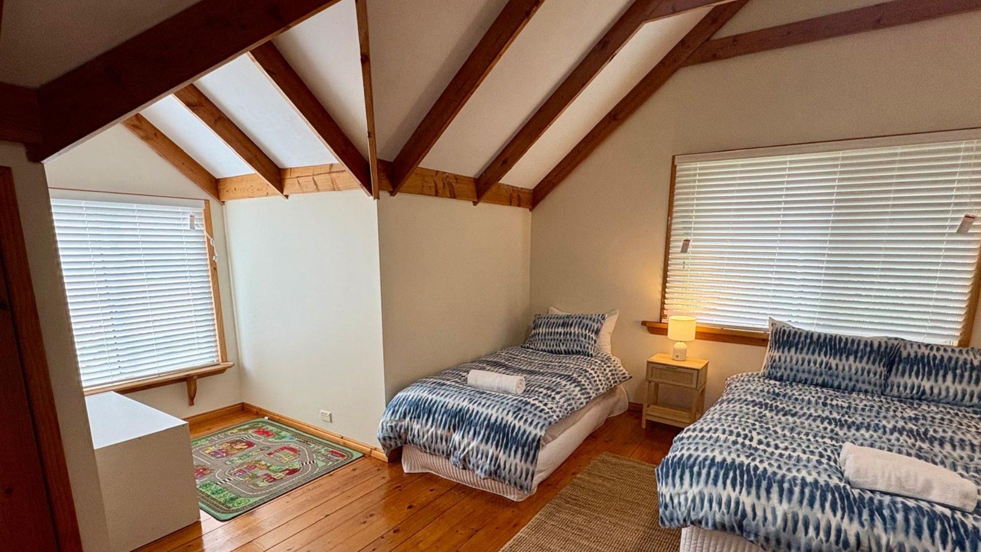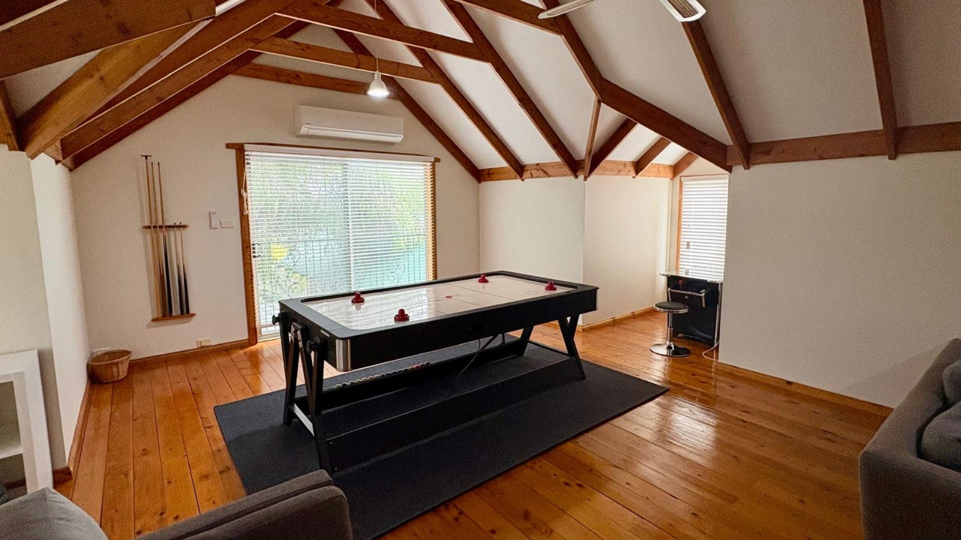 Upstairs, there is a second bedroom with a queen bed and a single bed, making it an ideal space for families or groups. Adjacent to this bedroom is the games room, a fantastic retreat for both kids and adults. The games room is equipped with an air hockey table that can flip a pool table, a TV, a Wii game station, and arcade game, a selection of books, and children’s toys. To ensure year-round comfort, this area also has reverse cycle air conditioning.