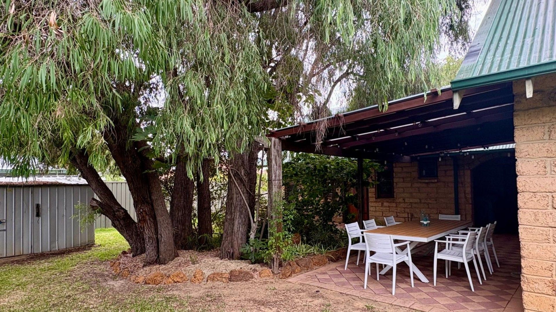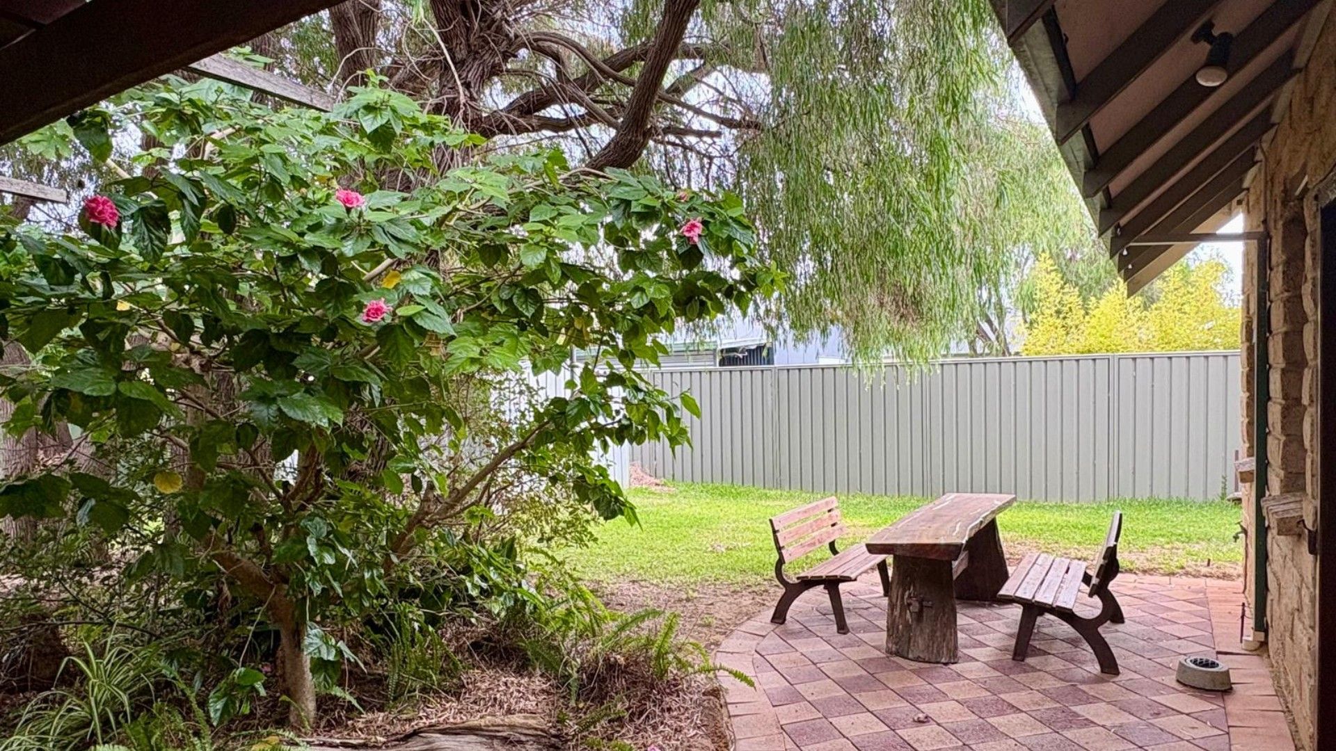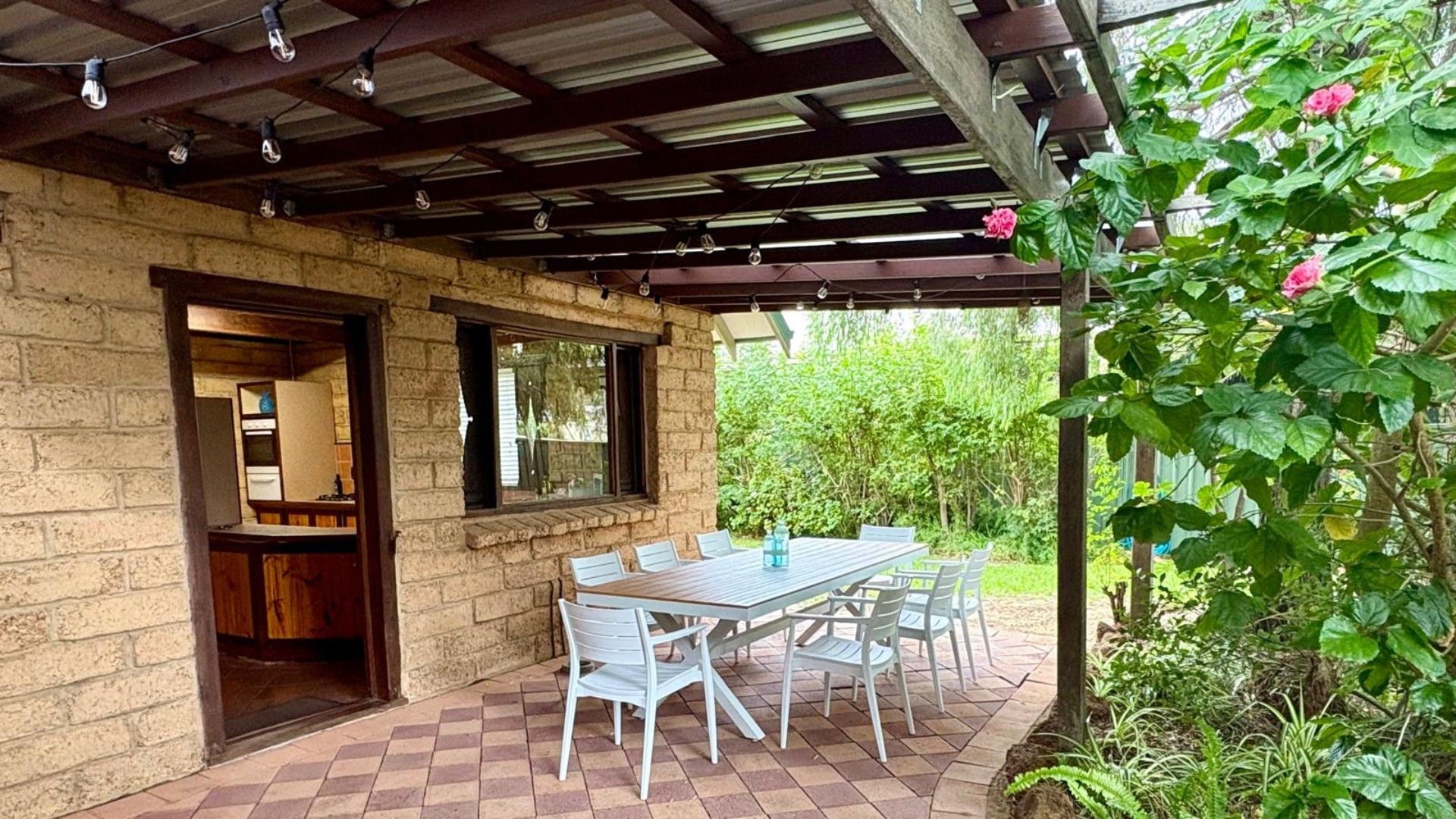The outdoor areas of Timber Tides Retreat provide plenty of space to relax and enjoy the natural surroundings. An undercover patio offers an outdoor dining area, perfect for alfresco meals, while a second outdoor table and chairs are set amongst the trees, creating a peaceful spot to enjoy the fresh air. The large backyard is a wonderful space for both adults and children, with lush green grass, mature trees, and well-maintained gardens adding to the home’s serene ambiance.