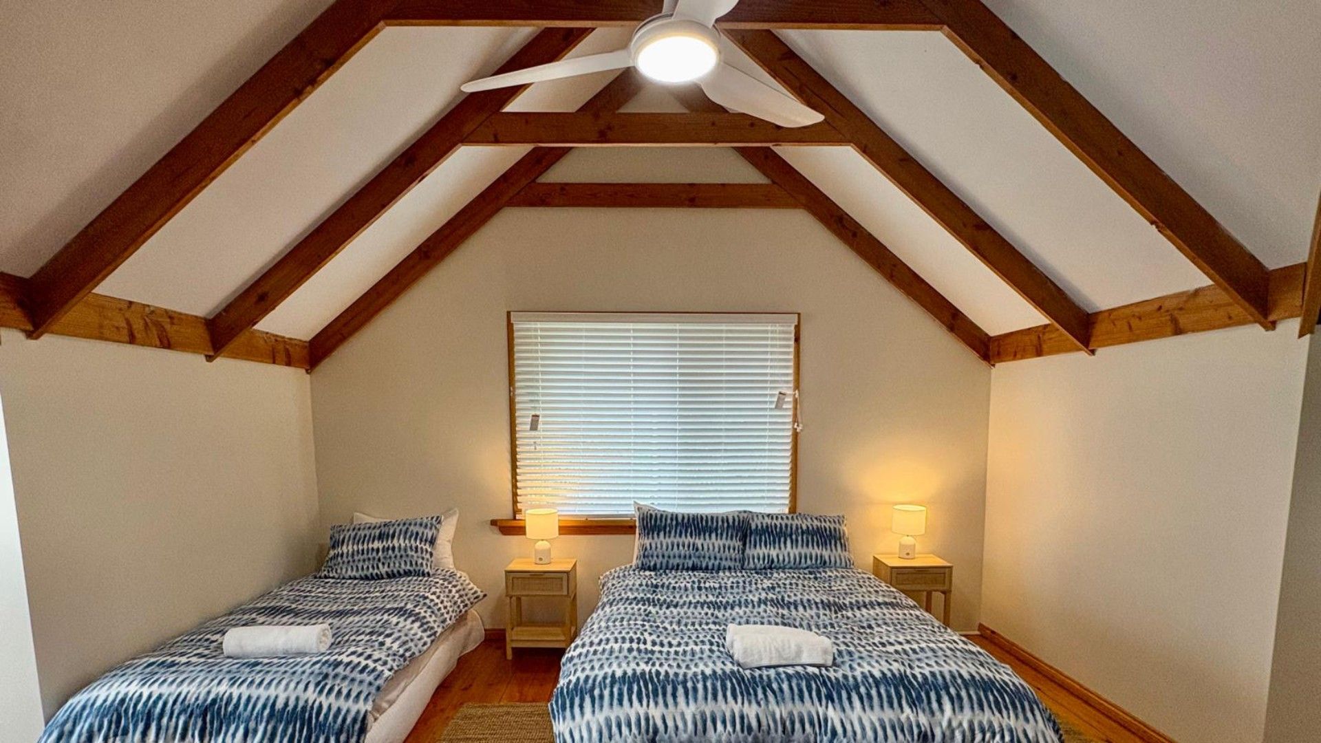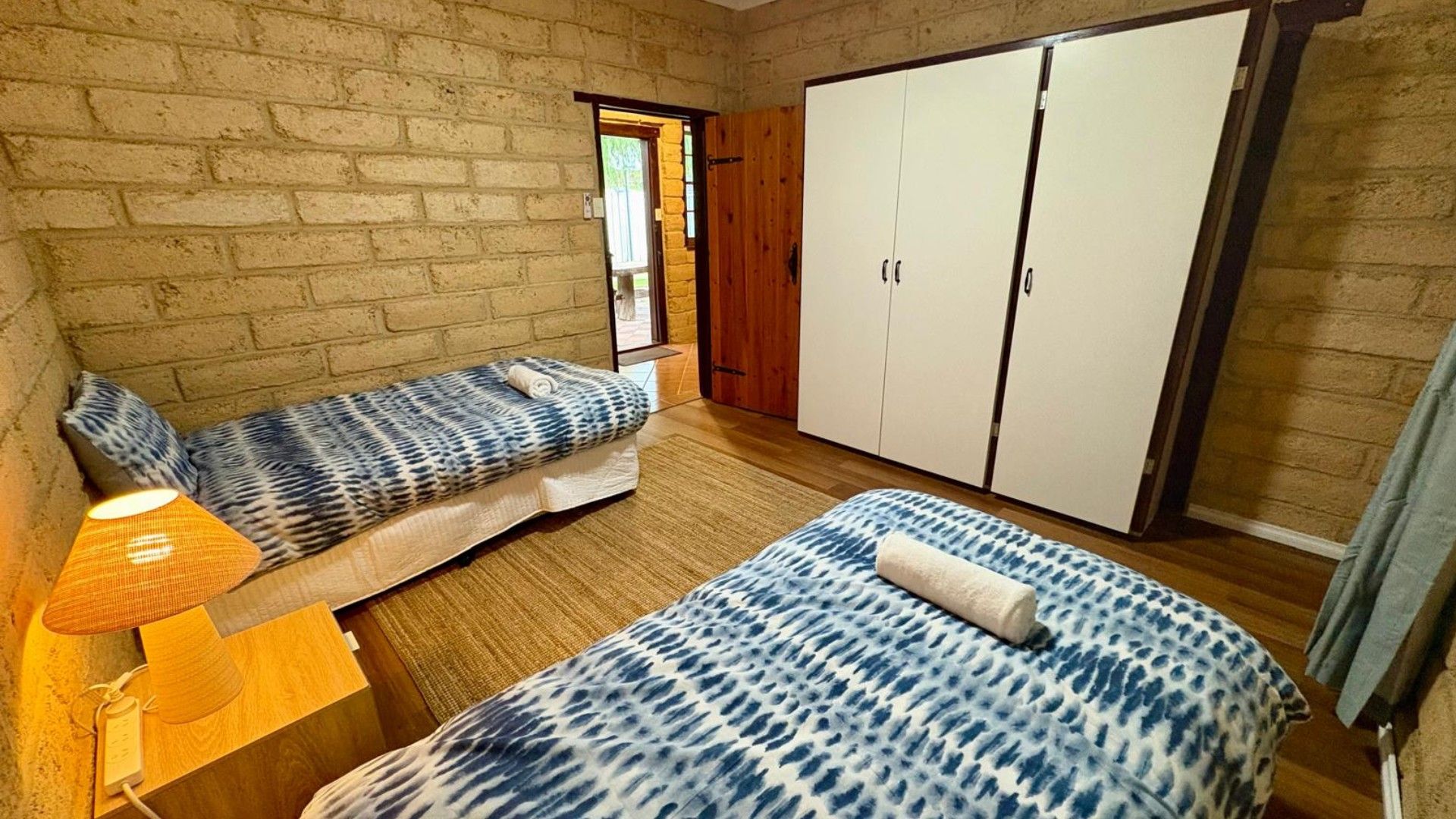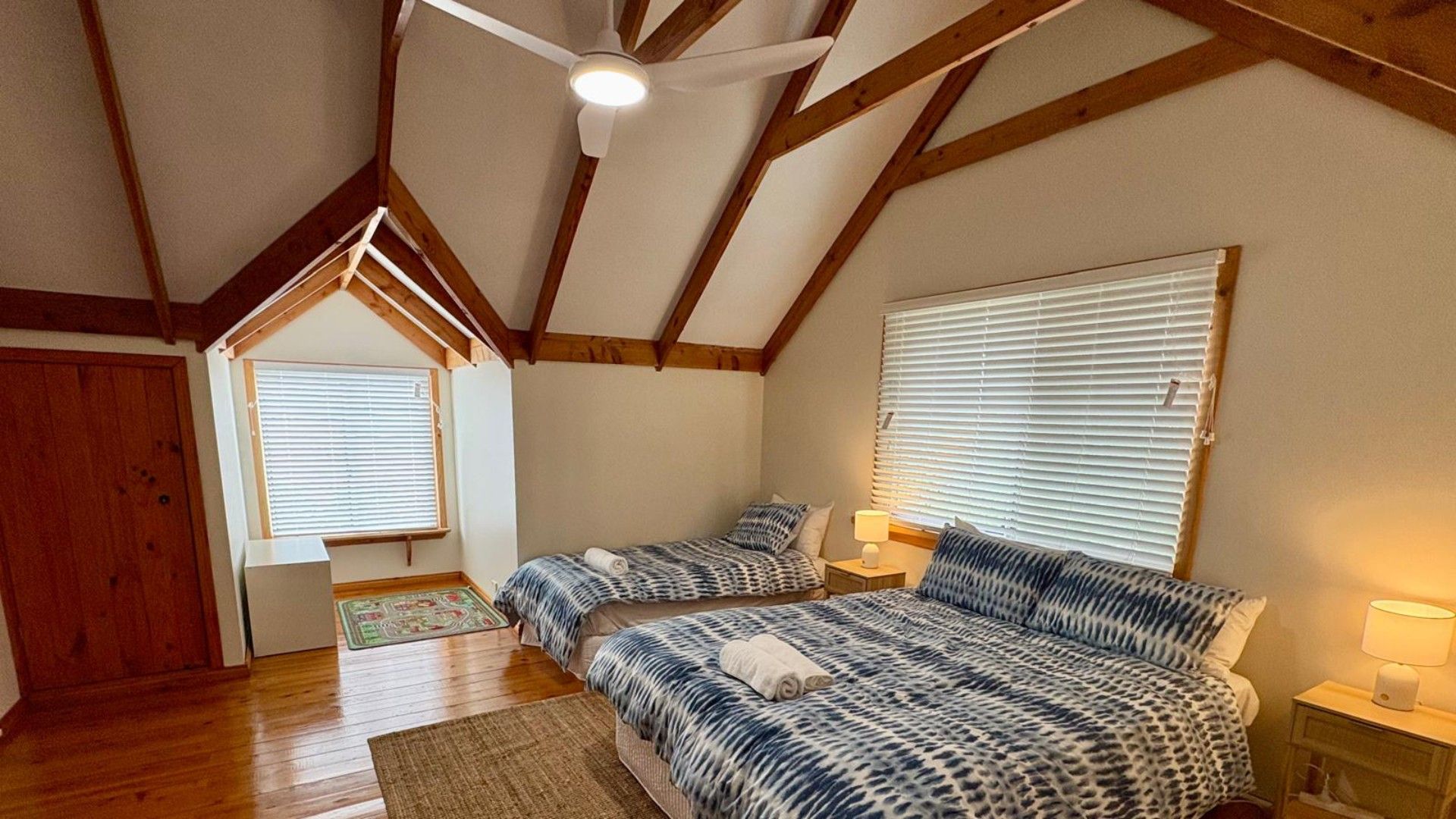 The separate rear building contains two additional bedrooms and a shared bathroom. The third bedroom features a queen bed, while the fourth bedroom has two single beds. Both rooms have ample storage space, providing a comfortable stay for guests. The shared bathroom includes a shower and a separate toilet area, making it a practical and functional space for families or larger groups.